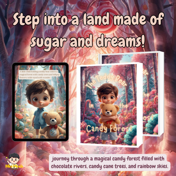 Follow a curious little child and a talking teddy bear as they journey through a magical candy forest filled with chocolate rivers, candy cane trees, and rainbow skies.
