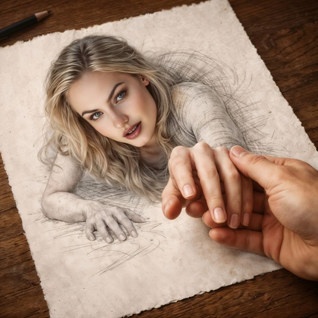 This surreal portrait plays with reality—half sketch, half living moment—as I reach out of the drawing to take your hand. Intimate, dreamy, and beautifully detailed, it’s made to feel like you’re stepping into my world.