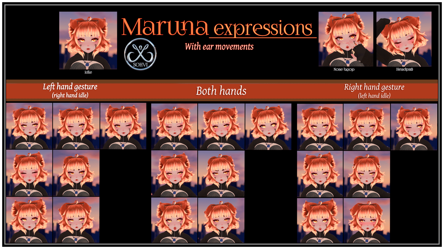 VRChat avatar, SDK 3.0, Unity 2022, 21 custom expressions with ear movements, write defaults off. Physbones, jiggles where expected + moving clothing details etc. Ton of scratch assets, Gogo locomotion etc! Full version and Optimized Medium version, PC only. Face tracking with ear movements