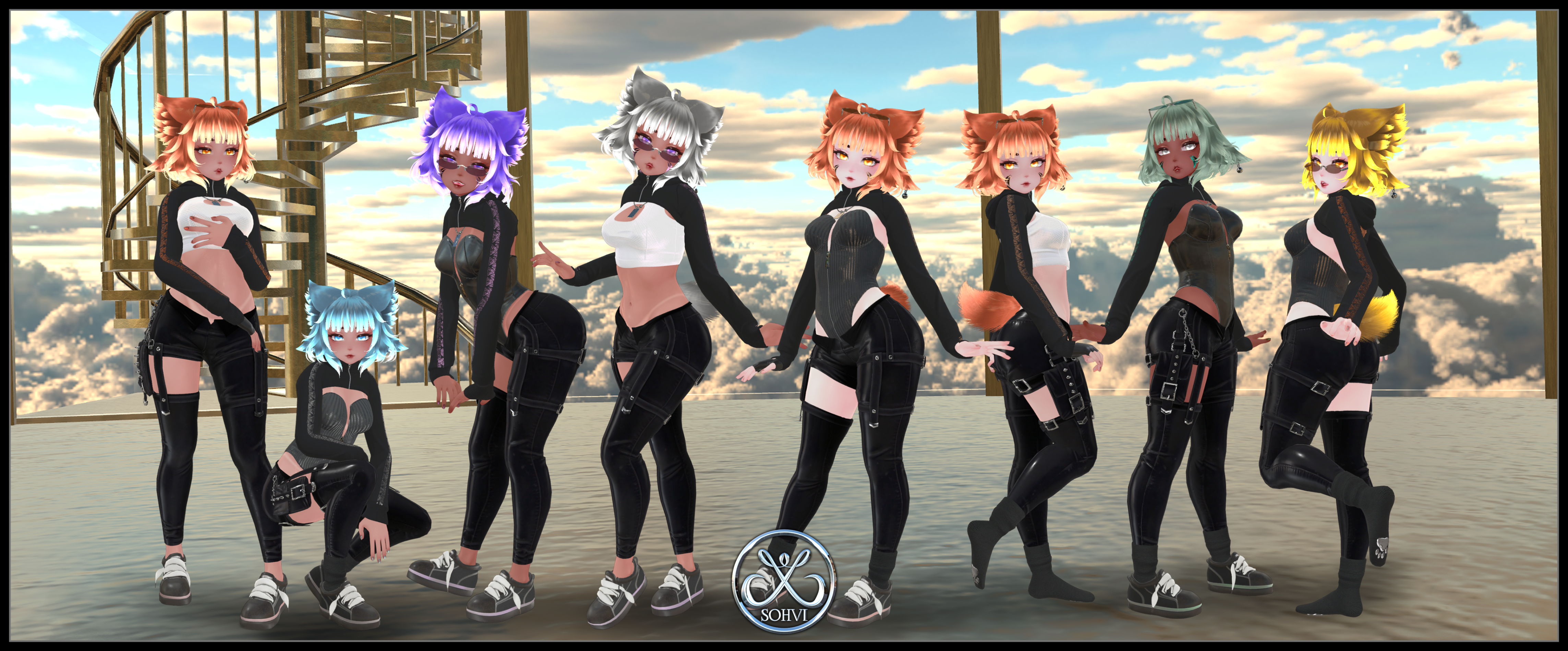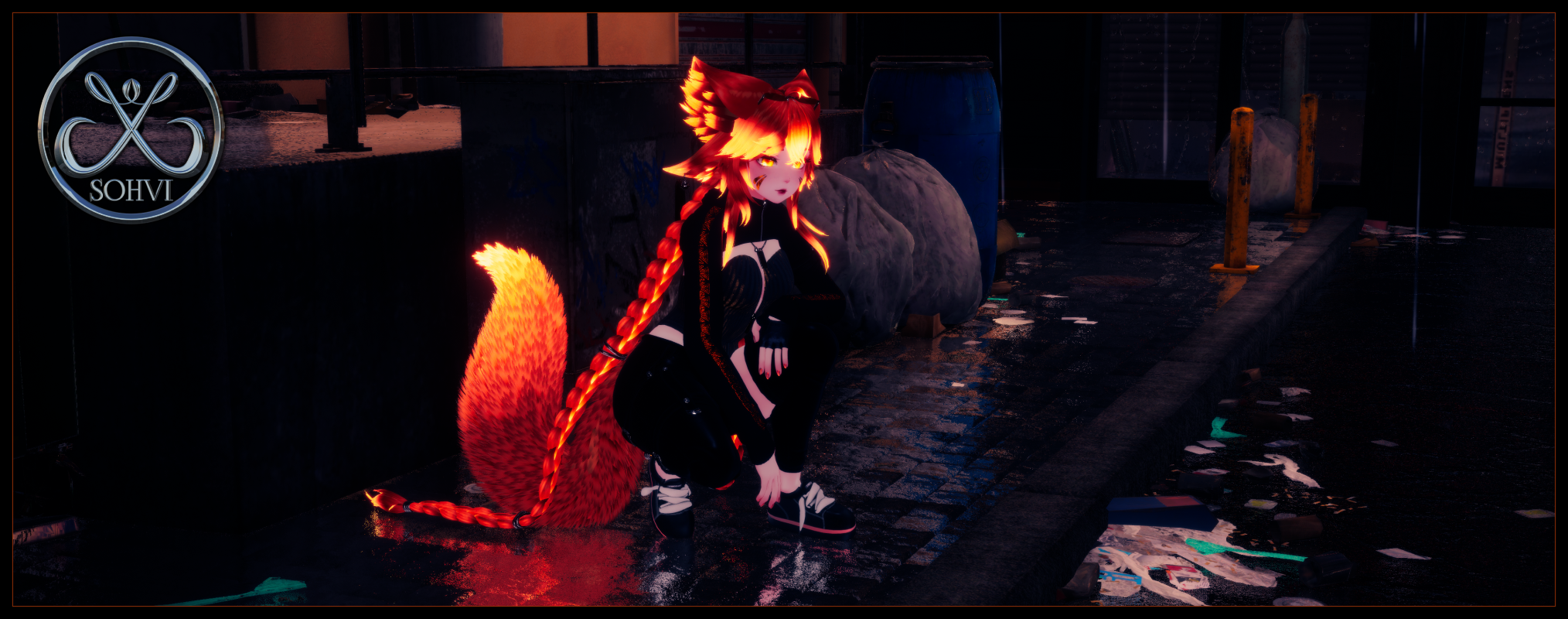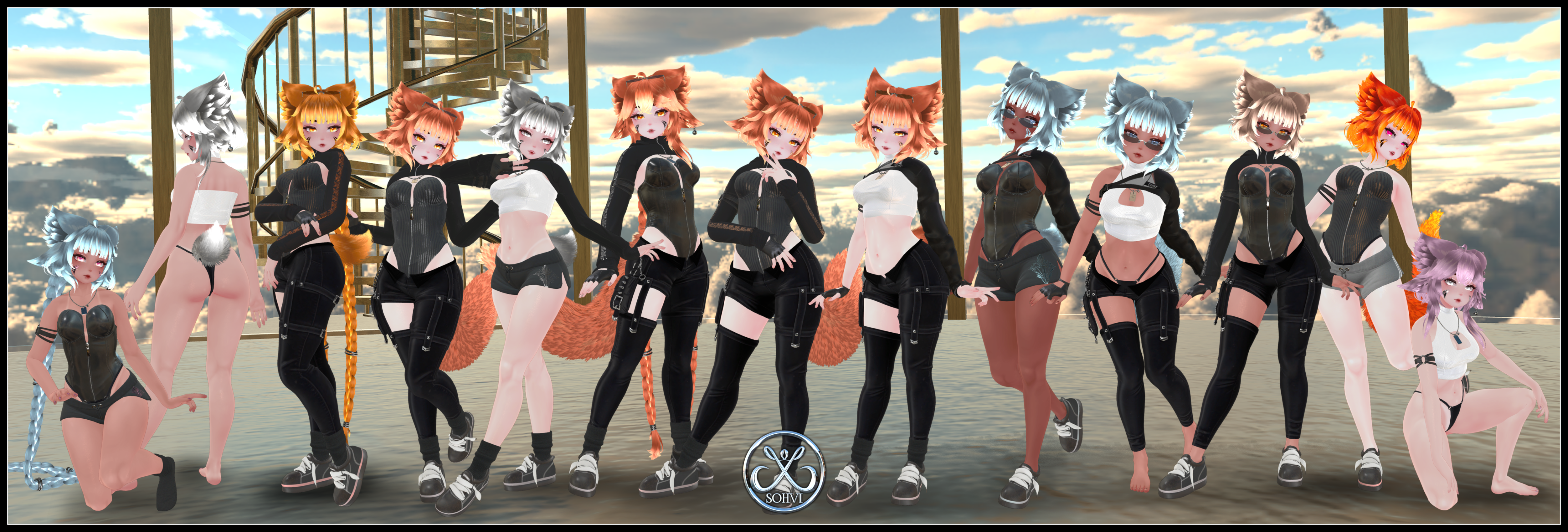 All other clothing and accessories, Big tail, Eye texture, Contact particles, Menu icons by me (sohvi.art) in Blender, Substance Painter and Clip studio paint. All images used are clip studio brushes or hand painted.