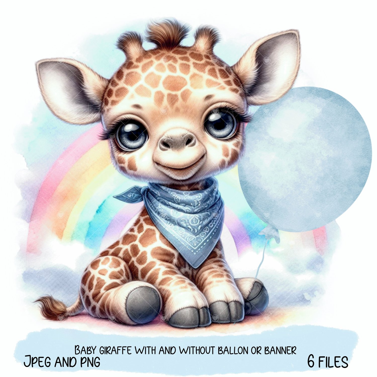 Beautiful newborn baby giraffe, birth announcement, nursery. 3 styles, balloon, banner, giraffe only. PNG & JPEG. Sublimation, print. Blue. Ideal for clothing, cups, prints, greetings cards, baby birth announcements, gender reveal etc. 6 files.
