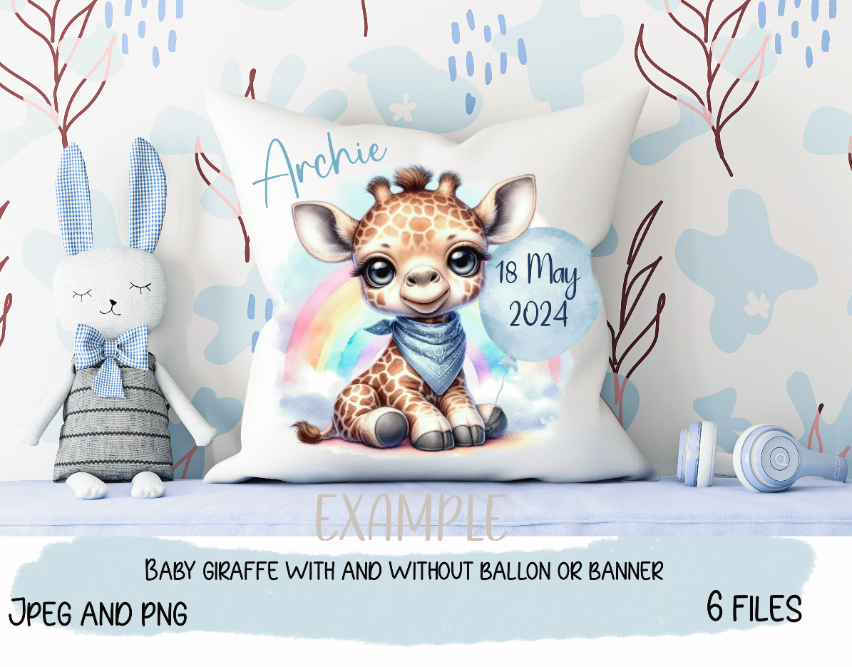 Beautiful newborn baby boy giraffe, birth announcement, nursery. 3 styles, balloon, banner, giraffe only. PNG & JPEG. Sublimation, print. Blue. Ideal for clothing, cups, prints, greetings cards, baby birth announcements, gender reveal etc. 6 files.