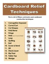 This resource features a page with labeled photographs of 15 different cardboard relief sculpture techniques. This page can be printed as a poster or handout for students as they practice skills or are work on creating their sculptures