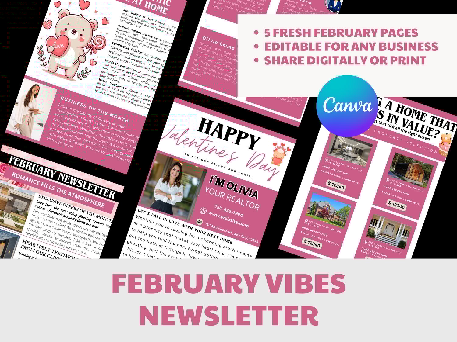 Fully editable in Canva, you can change colors, text, images, and fonts to match your brand vibe or your client’s style. Print it, share it digitally, or even package it as part of your services — the possibilities are endless. With the February Vibes Newsletter, creating professional, eye-catching monthly updates has never been easier.