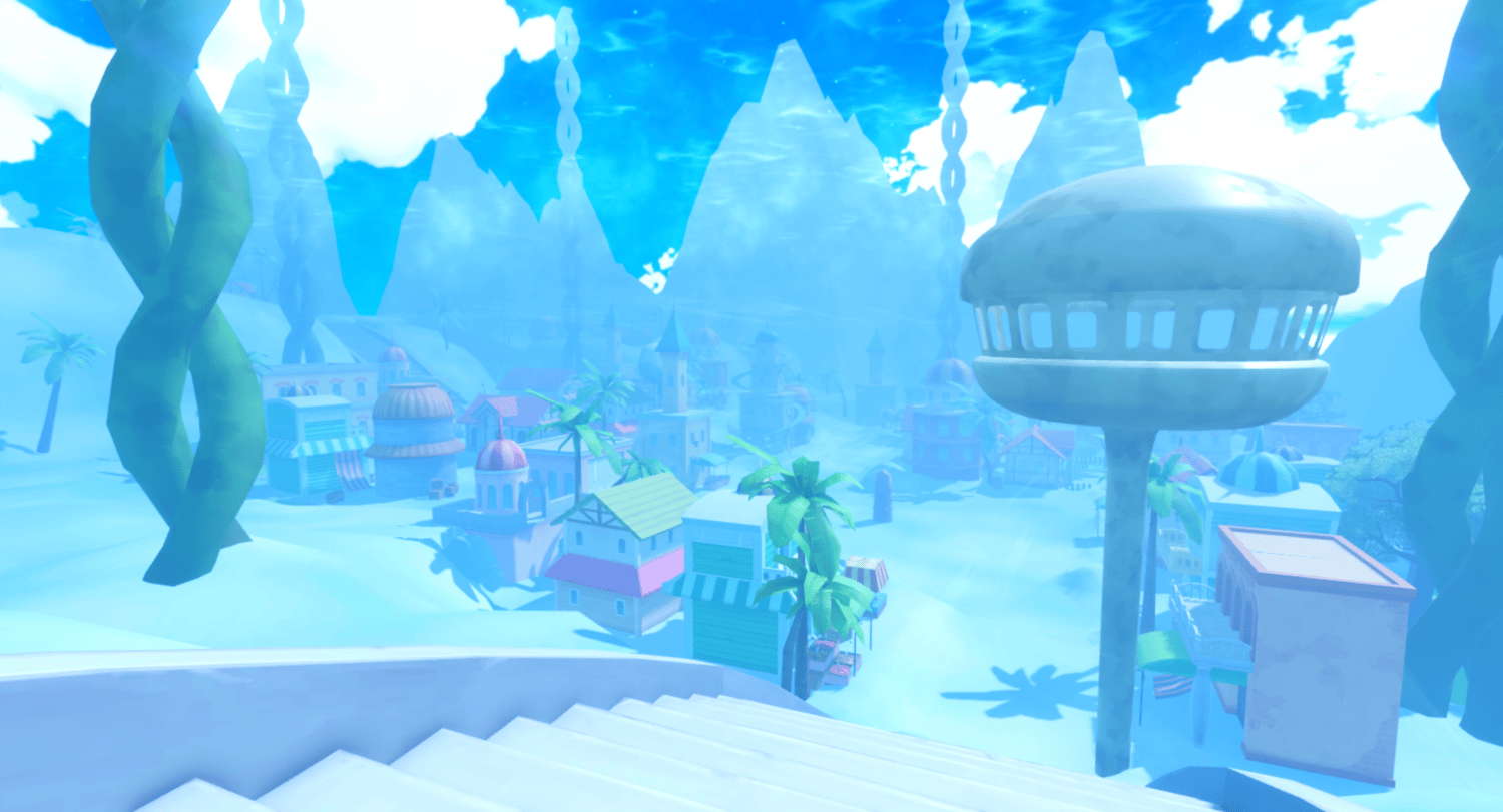 A detailed Skypiea-inspired sky island featuring cloud terrain, elevated streets, and pastel buildings. The map includes open walkways, market areas, rooftops, and layered vertical paths. Soft lighting, fog, and sky backdrops create a high-altitude atmosphere. Perfect for adventures, RPGs, showcases, roleplay, or combat scenarios.
