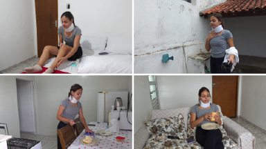 - Waking up, combing hair, applying moisturizer to legs, recording a vlog about her soft collar, picking up a package from the mailbox at the gate, collecting clothes from the clothesline, walking through the backyard of the house, close-up of the soft collar, watching TV, preparing a hot dog and eating it.