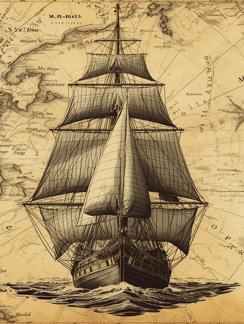 Majestatyczny żaglowiec sunący po otwartym morzu, osadzony na tle antycznej mapy, oddaje ducha podróży, wolności i odwagi.