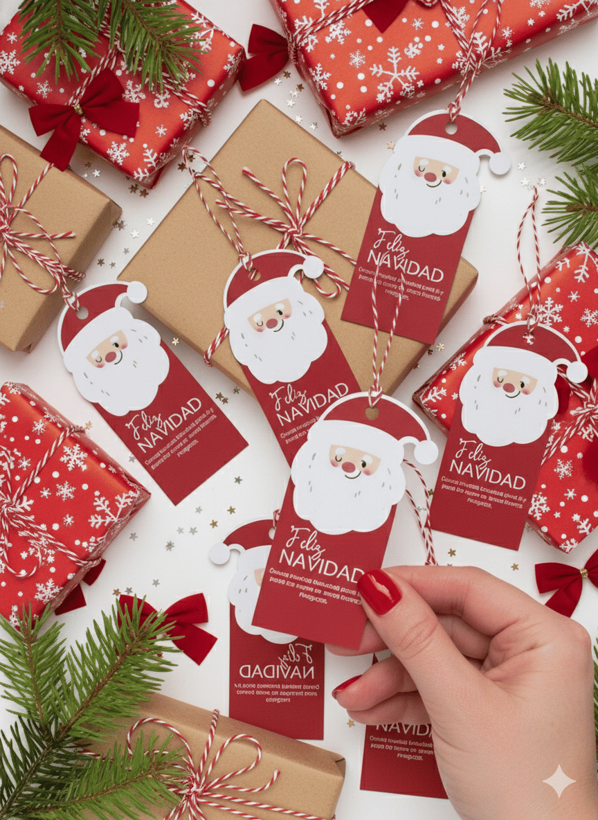 Lindo Tag Colgante para tus presentes en estás navidades. Formato pdf A4. Con espacio editable para redes sociales.