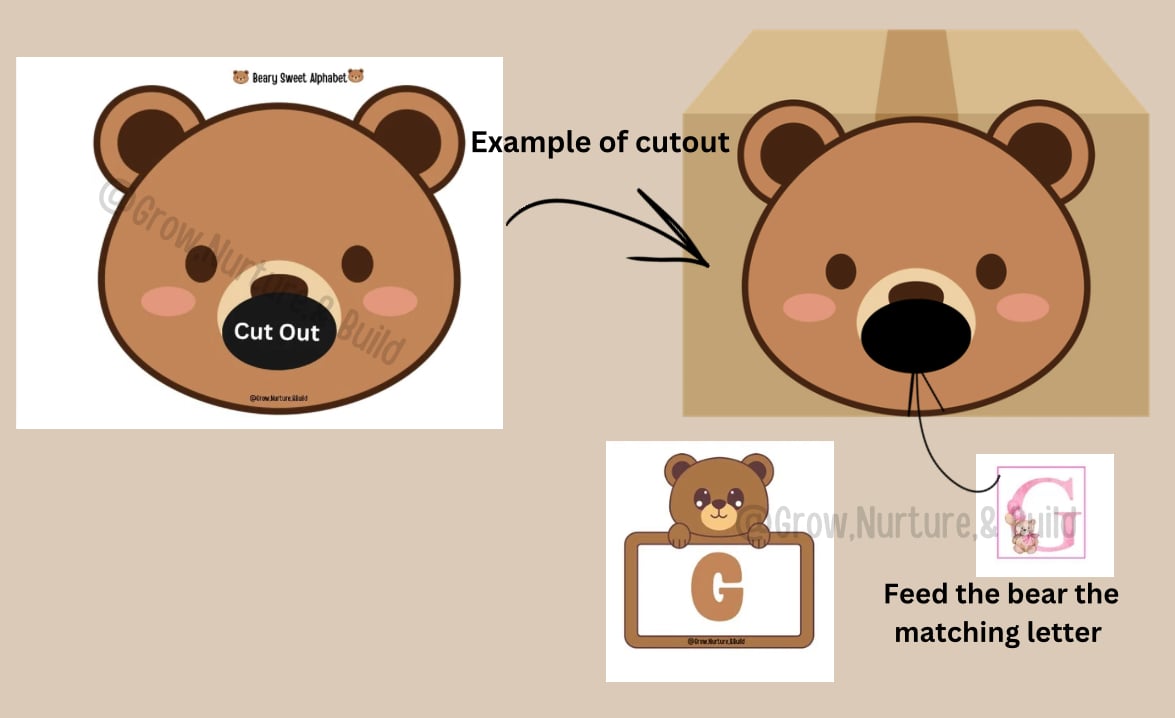 This printable set includes bear alphabet cards and a “Feed the Bear” activity, where toddlers choose a letter card and feed the matching teddy bear letter into the bear’s mouth. Cards can be used on a container or box, in sensory bins for search-and-find play, or as simple alphabet cards—offering multiple ways to learn and explore.