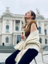 Für das hier gezeigte Modell (Grösse L) wurde Penny Lane Yarns, Garn A: Wonder Lane (50% Mulberry Seide, 50% Baby Kamel) fingering weight (400m / 437yrds per 100g) und Garn B: Spring Lane (50% Baby Alpaka, 25% Seide, 25% Leinen) lace weight (600m / 656yrds per 100g) beide in der Farbe Taggiasche.