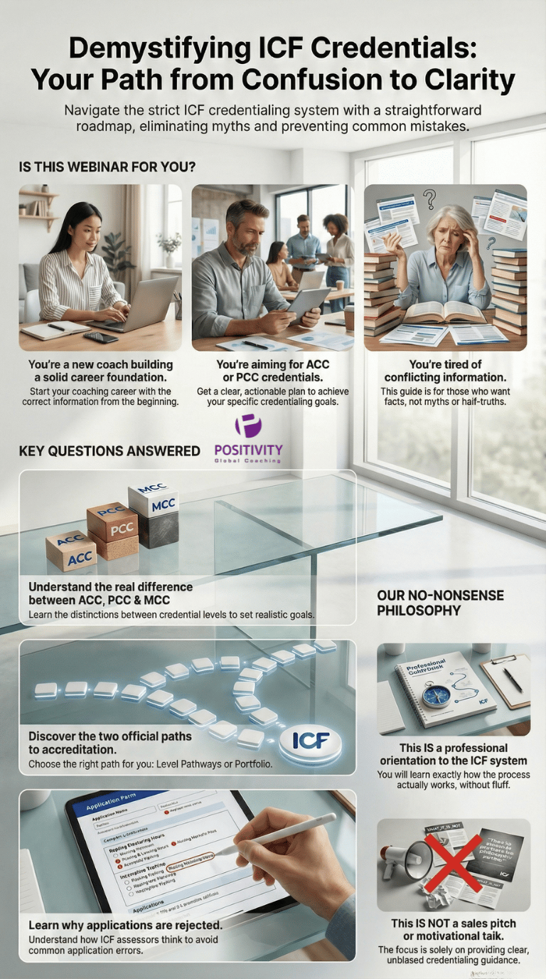 The course addresses critical questions, including the definition and value of ICF credentials, the real differences between ACC, PCC, and MCC levels, and the two official paths to accreditation (Level pathways and Portfolio).