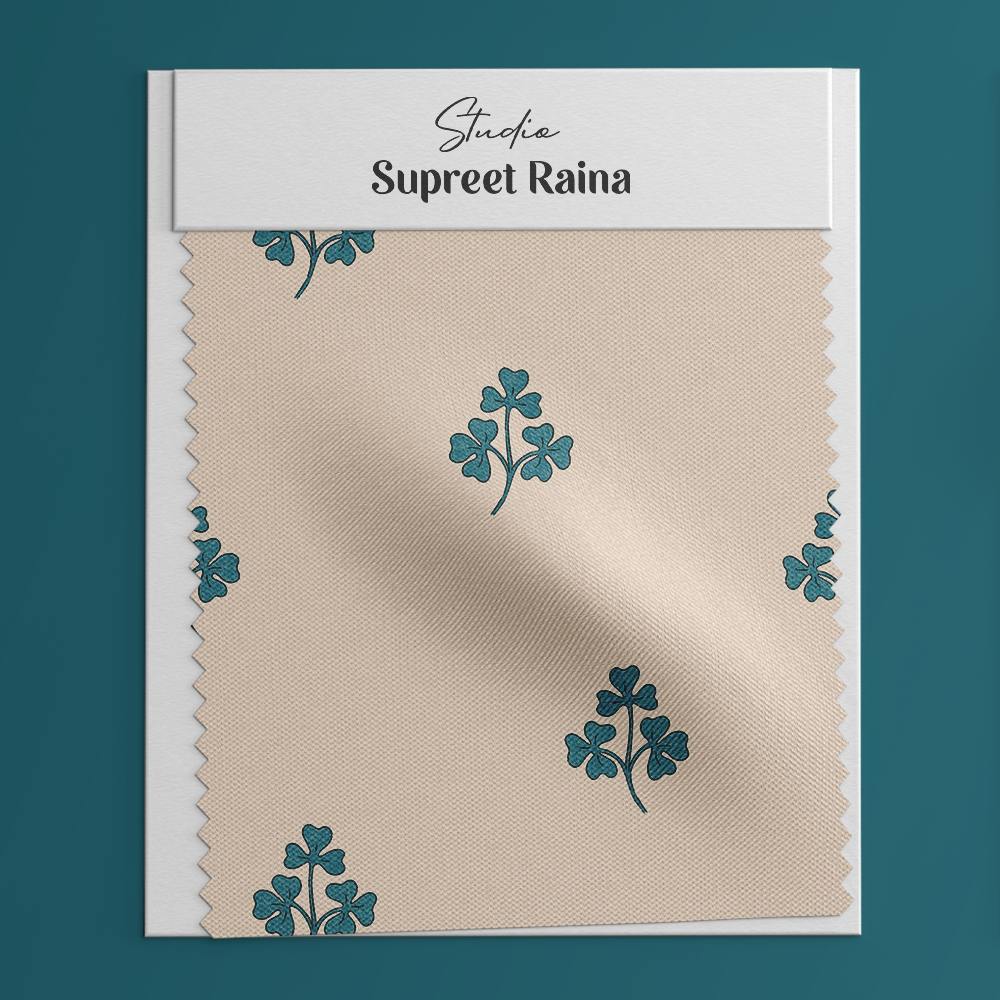 A minimal clover-inspired seamless pattern featuring delicate hand-drawn green leaves scattered across a warm neutral background. This soft botanical repeat feels calm, nostalgic, and subtly symbolic — perfect for timeless surface design applications.