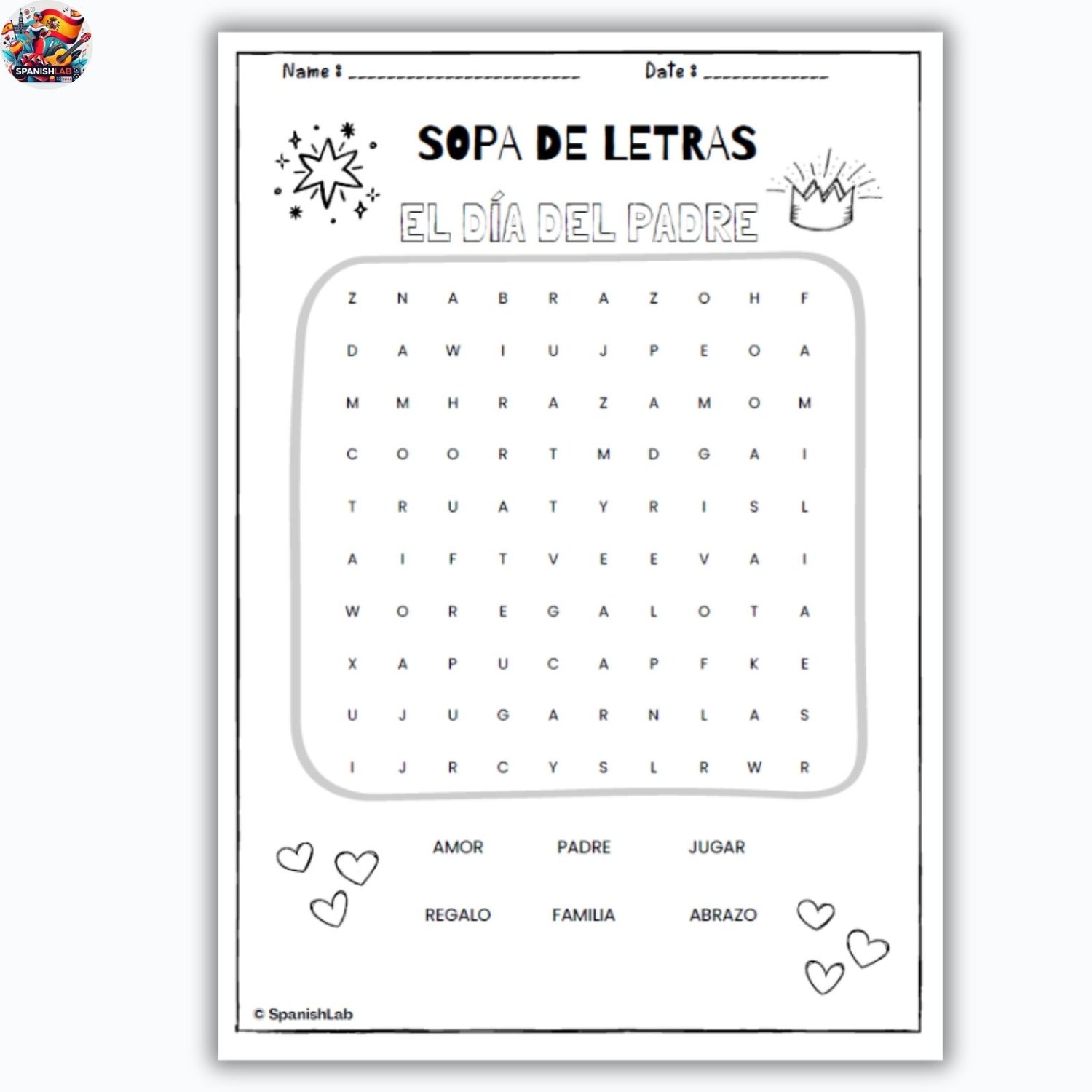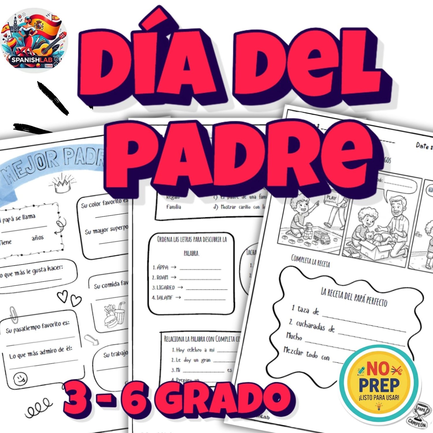 This printable Father’s Day activity booklet by SpanishLab is designed for students in 3rd to 6th grade. It helps children practice reading, writing, vocabulary, and descriptive language while reflecting on their relationship with their fathers or family role models.