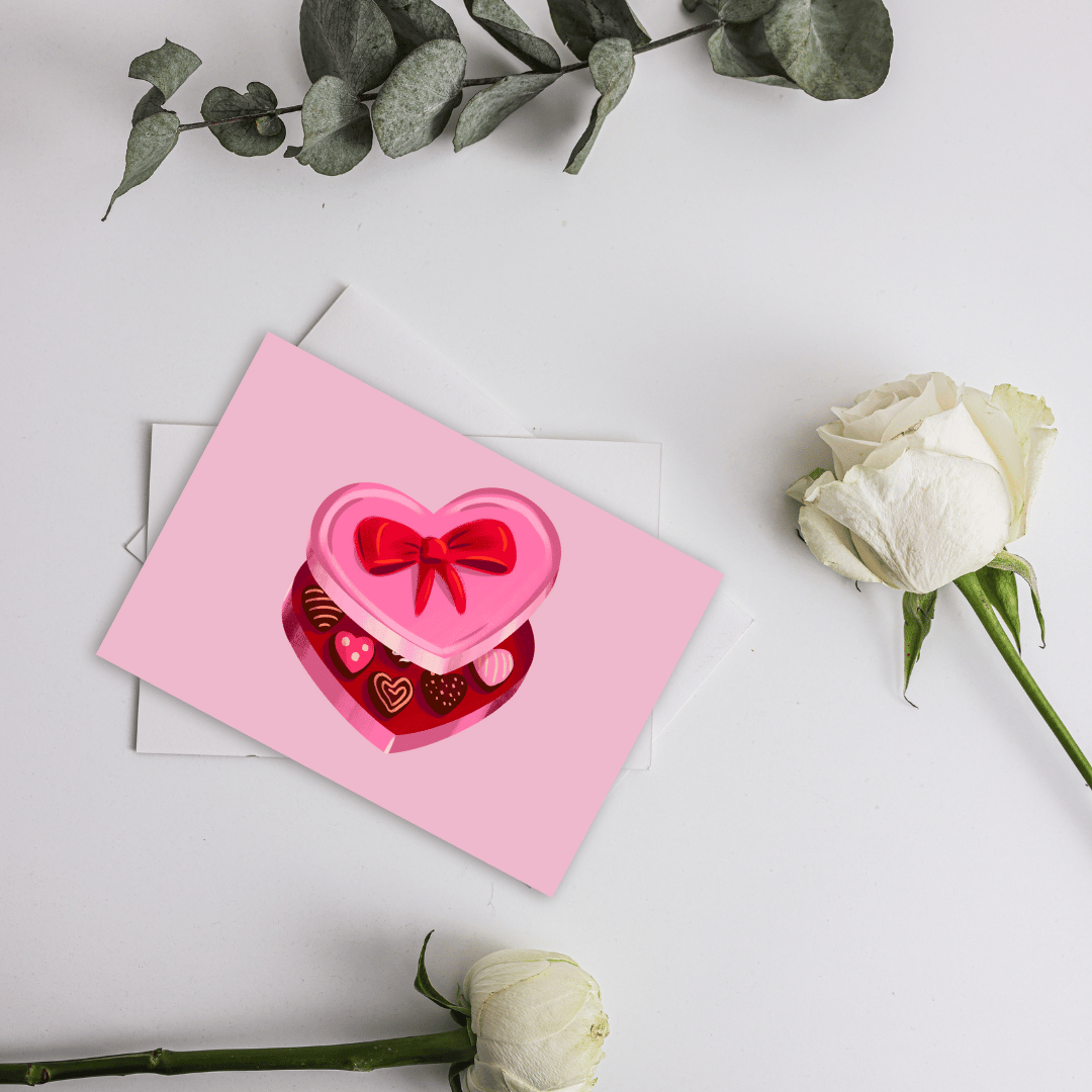 Celebrate love with this adorable Valentine's Day postal card, perfect for couples who want to express their feelings in a meaningful way. The front features a cute illustration of a heart-shaped box filled with chocolates, surrounded by a pink and red aesthetic that exudes romance. The back includes a "Happy Valentine's" greeting and lines to handwrite a heartfelt message for your special someone. Whether it's for your boyfriend, girlfriend, or someone you love, this card is the ideal gift to surprise them on February 14th. Share a memorable moment and show how much they mean to you with this sweet gesture.