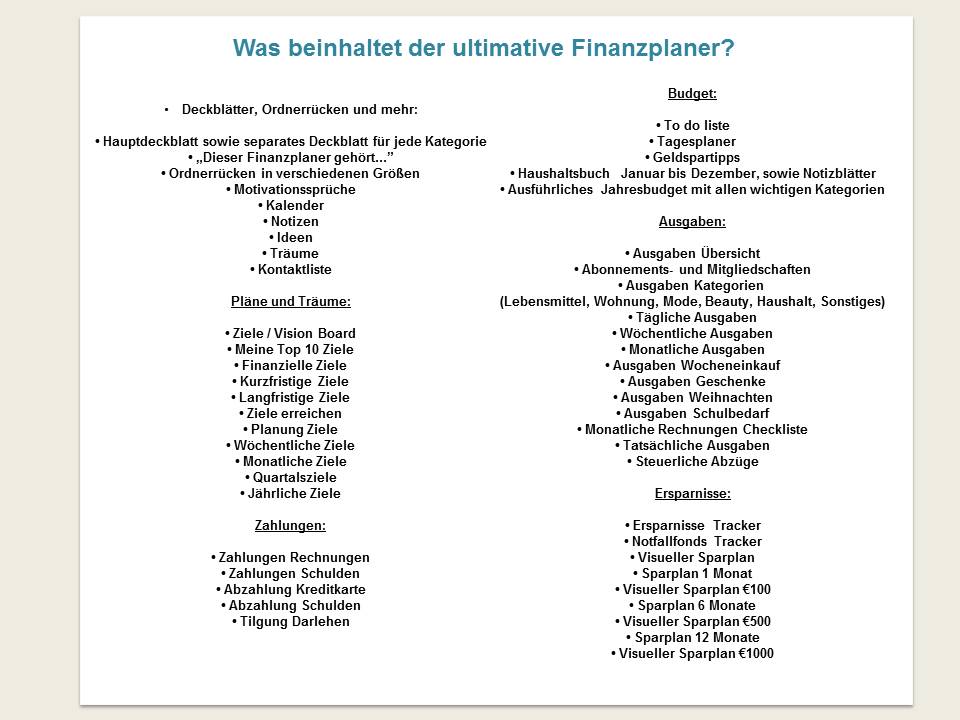 Der ULTIMATIVE Finanzplaner ist voll gepackt mit all dem was du brauchst, um auf Kurs zu bleiben und dein Geld besser zu verwalten! Dazu gehören natürlich auch deine Pläne und Ziele für die Zukunft, ein ausführliches Jahresbudget und wichtige Geldspartipps!