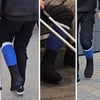 When he gets there, he has to wait. This gives us the opportunity to look at him and his cast from different perspectives. It is a lower leg plaster splint held by a blue fixation bandage. He wears a black sock over his toes and the entire foot area. You can guess the shape of the toes.
