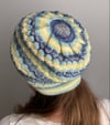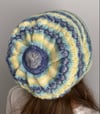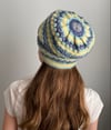If self-striping yarn on its own isn’t exciting enough, why not add some fun texture and a dramatic crown to spice up your wardrobe? This slouchy beanie, named for the pincushion cactus it resembles, is the perfect use for a skein of self-striping sock yarn that is perhaps too pretty to hide in your shoes. Worked in the round from the bottom up, it features a hemmed brim for fit and extra warmth, a fun textured bubble stitch, and eye-catching decreases in the form of pleats at the crown.