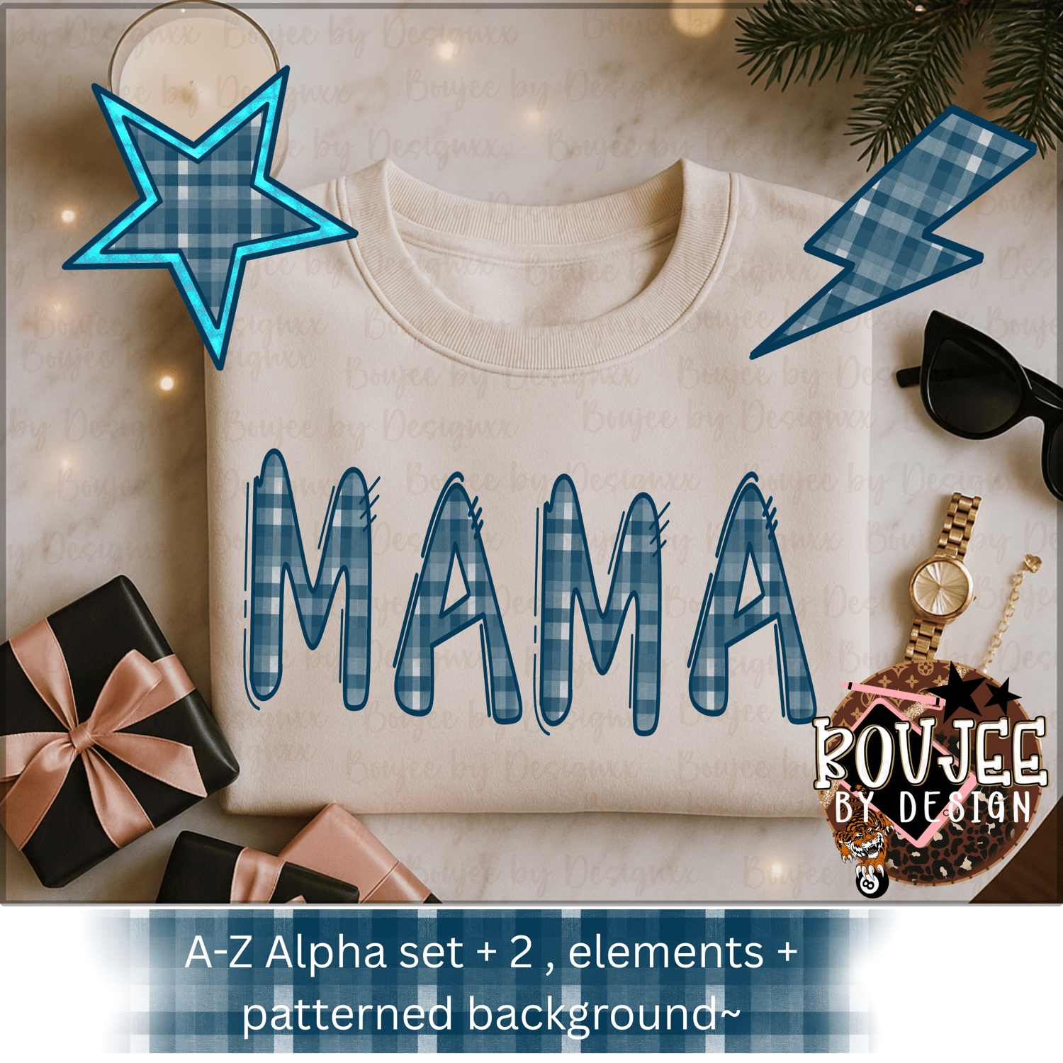 blue plaid alphabet, gingham alpha, PNG letters, digital alphabet, sublimation, DTF, plaid clipart, star lightning clip art, seamless background, farmhouse, rustic, winter plaid, Mama letters, Boujee by Designxx