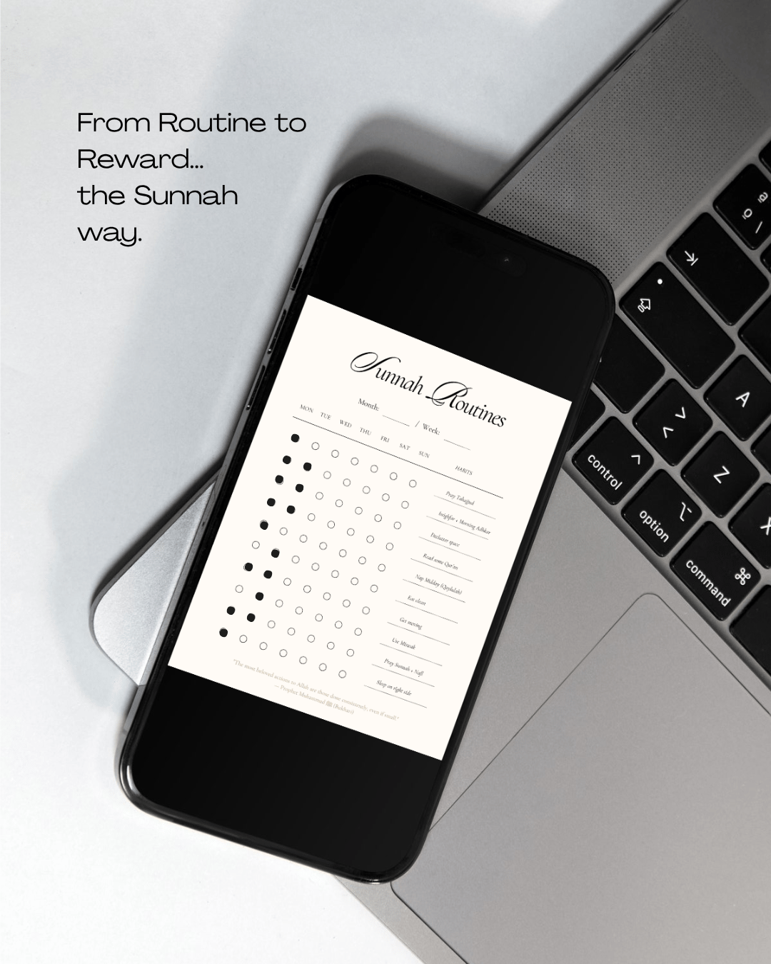 ✔️ 10 daily Sunnah habits (like Tahajjud, Morning Adhkar, Miswak, etc.)