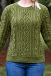 Materials: DK weight wool blend: 1660 (1810, 2030, 2230) (2365, 2570, 2810) (2960, 3140, 3360) yards. Model knit in Berroco Vintage DK (52% acrylic, 40% wool, 8% nylon; 100 grams / 290 yards): color #2175 Fennel.