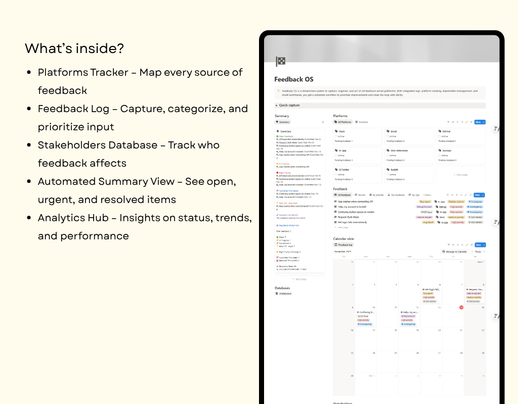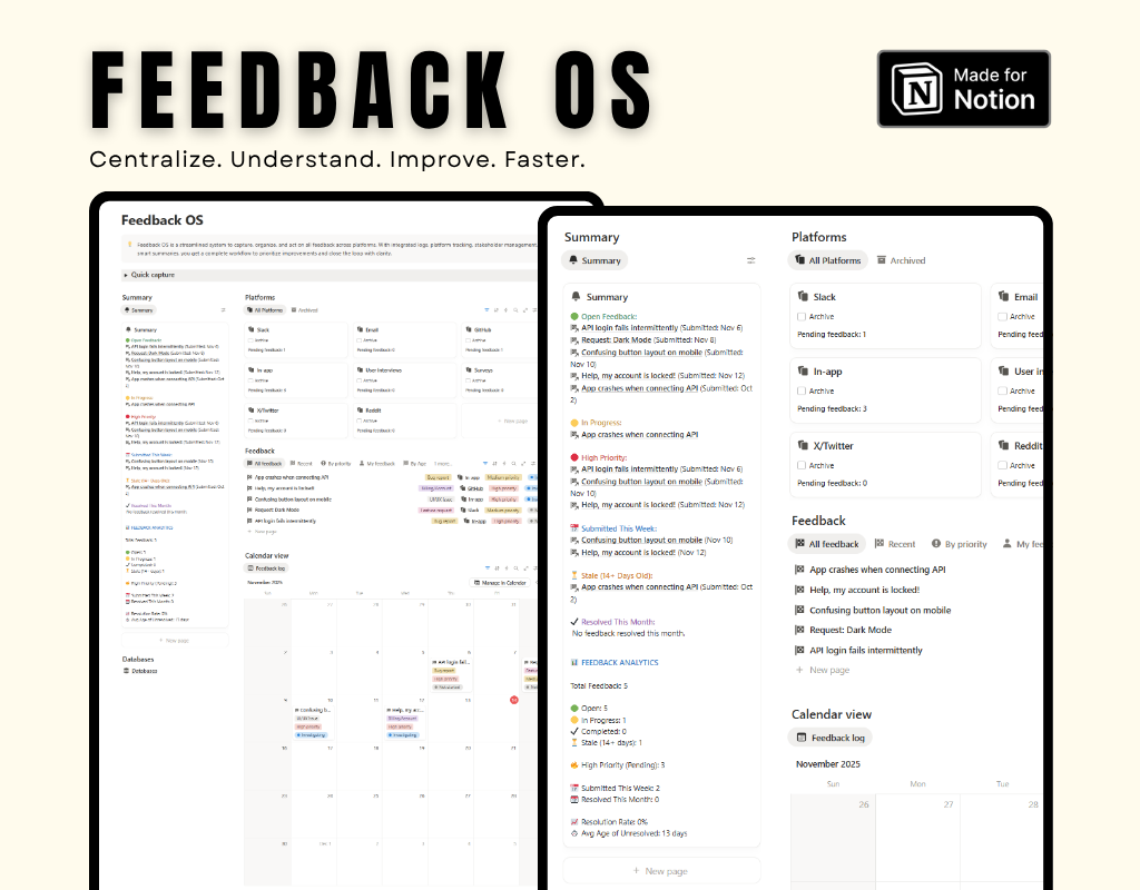 With dedicated databases for Platforms, Feedback Log, and Stakeholders, Feedback OS ensures you always know where feedback comes from, who it impacts, and what action is required. Whether you're improving a digital product, refining services, or managing a growing community, this system helps you stay organized, improve faster, and consistently close the loop with confidence.