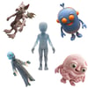 Step into the world of imagination with this whimsical collection of five unique 3D characters! This set includes a diverse range of creatures: a winged bat-like griffin, a glowing humanoid spirit, a cheerful alien with a blue body and orange accents, a wise robed sage with celestial patterns, and a squishy pink brain-like monster with adorable eyes. These designs are perfect for collectors, tabletop gaming enthusiasts, or fans of quirky art.