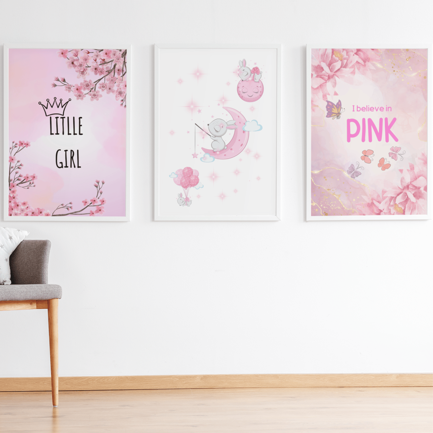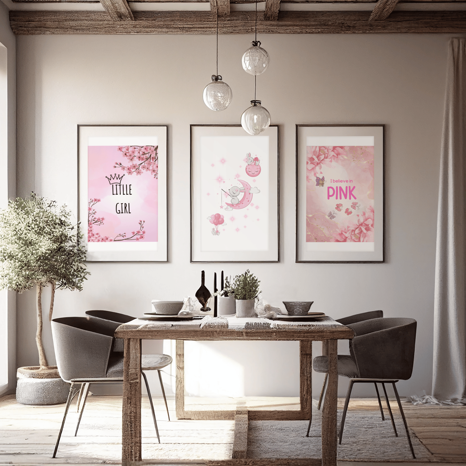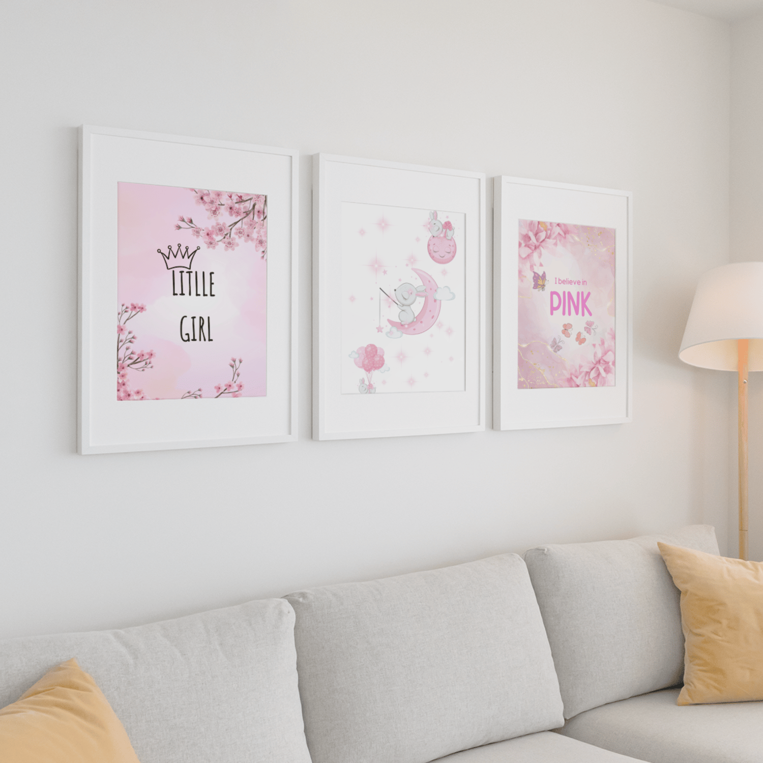 Create a sweet and dreamy nursery space with this adorable pink wall art set for baby girls.