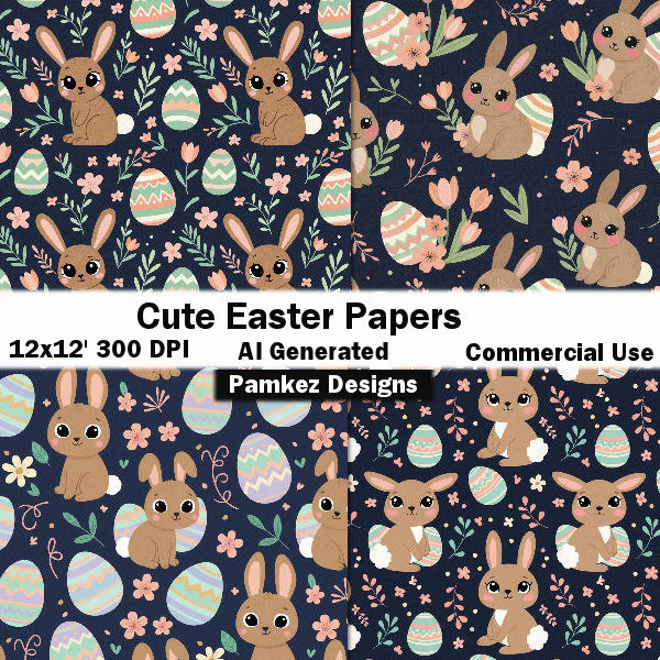 A charming Easter-themed digital paper pack featuring adorable wide‑eyed bunnies, pastel decorated eggs, and delicate spring florals on a rich navy background. These AI‑generated 12x12" papers are perfect for scrapbooking, card making, journaling, and all your seasonal craft projects.