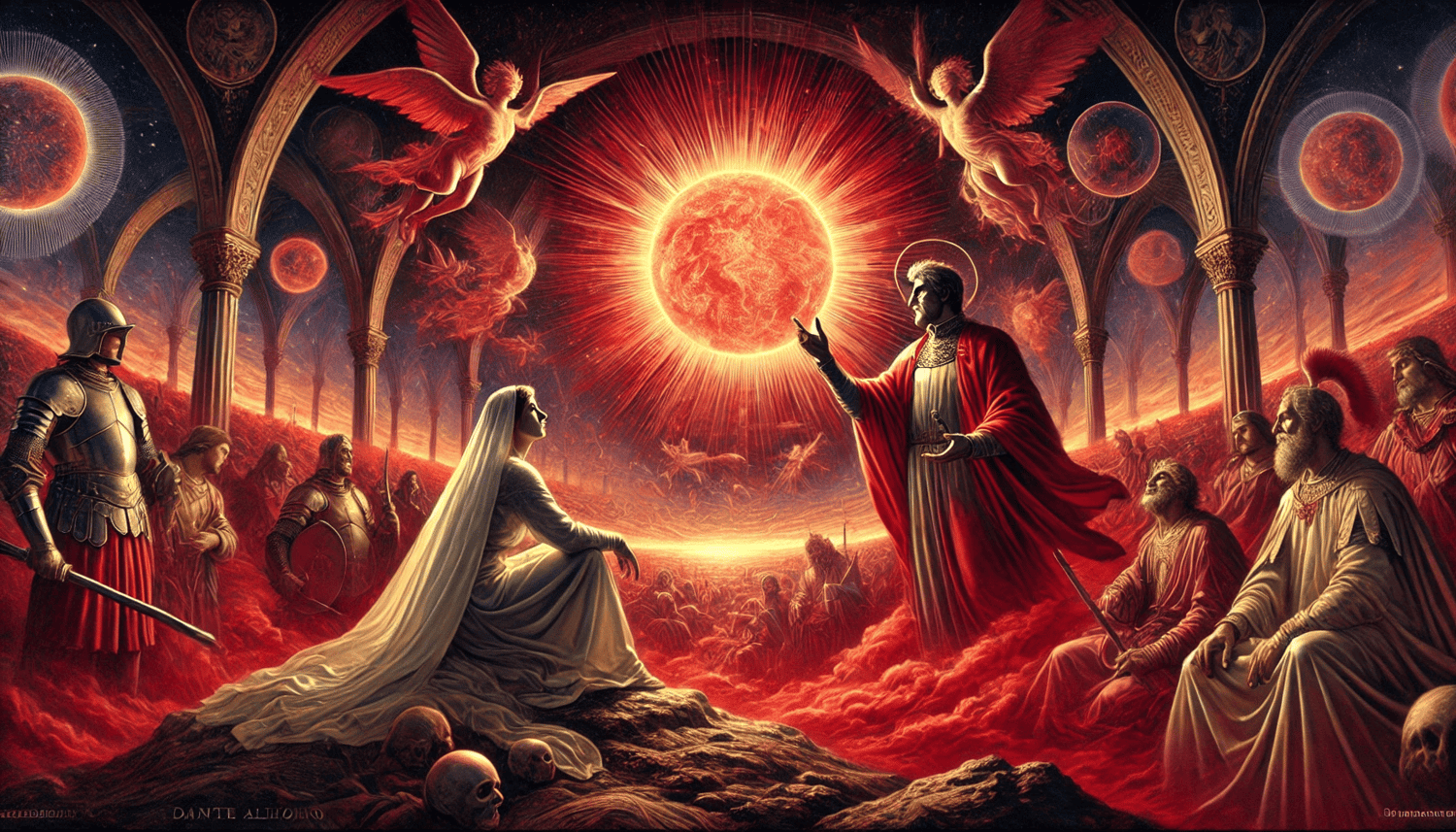 In the fiery realm of Paradiso, Dante meets his noble ancestor, Cacciaguida, who recounts the virtues and lost grandeur of ancient Florence. The scene is bathed in a crimson celestial glow, symbolizing the passion, sacrifice, and honor of a time long past. Warriors, scholars, and visionaries stand in solemn reverence, while angelic figures soar above, watching over the fate of the righteous. The intense red hues evoke the martial strength of Florence and the eternal flame of history that burns within its legacy.