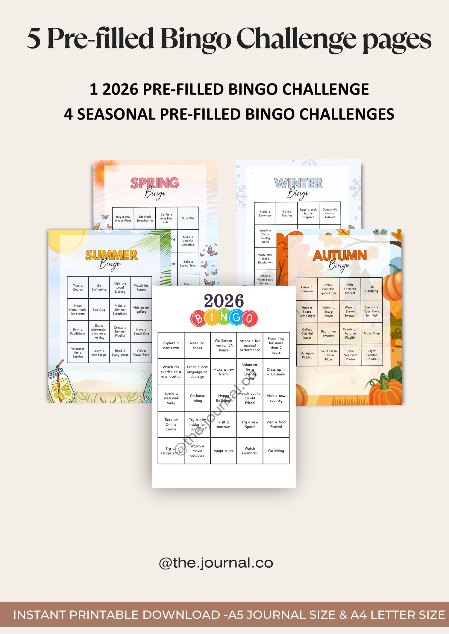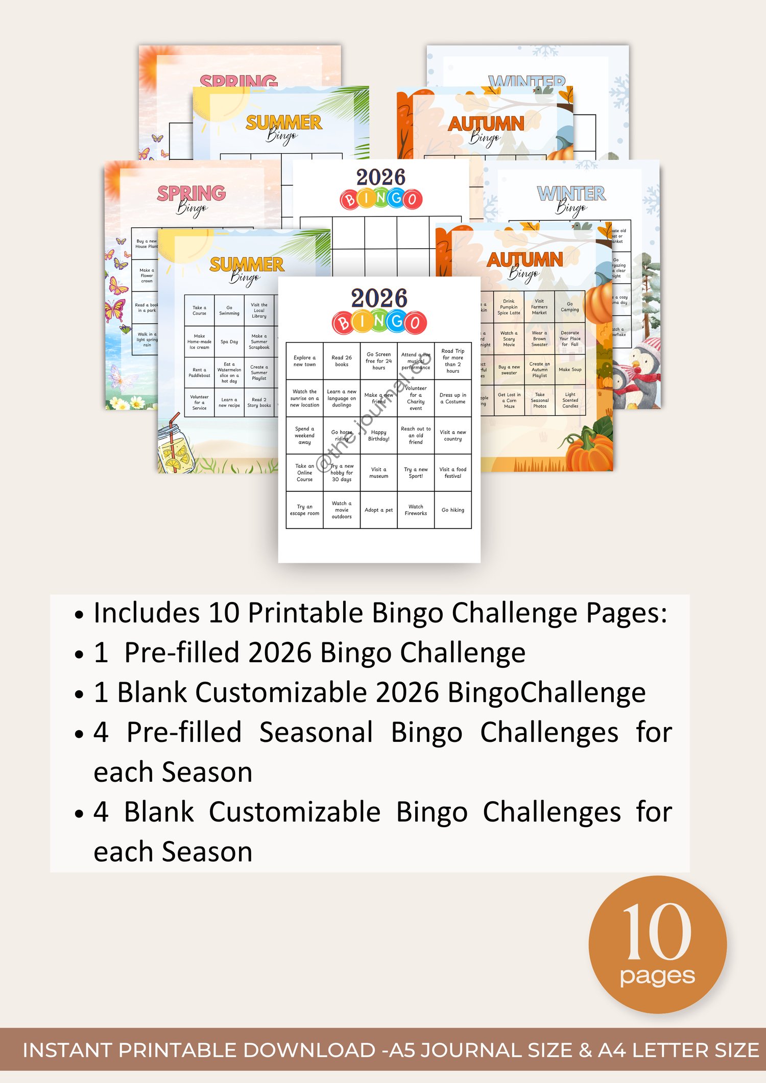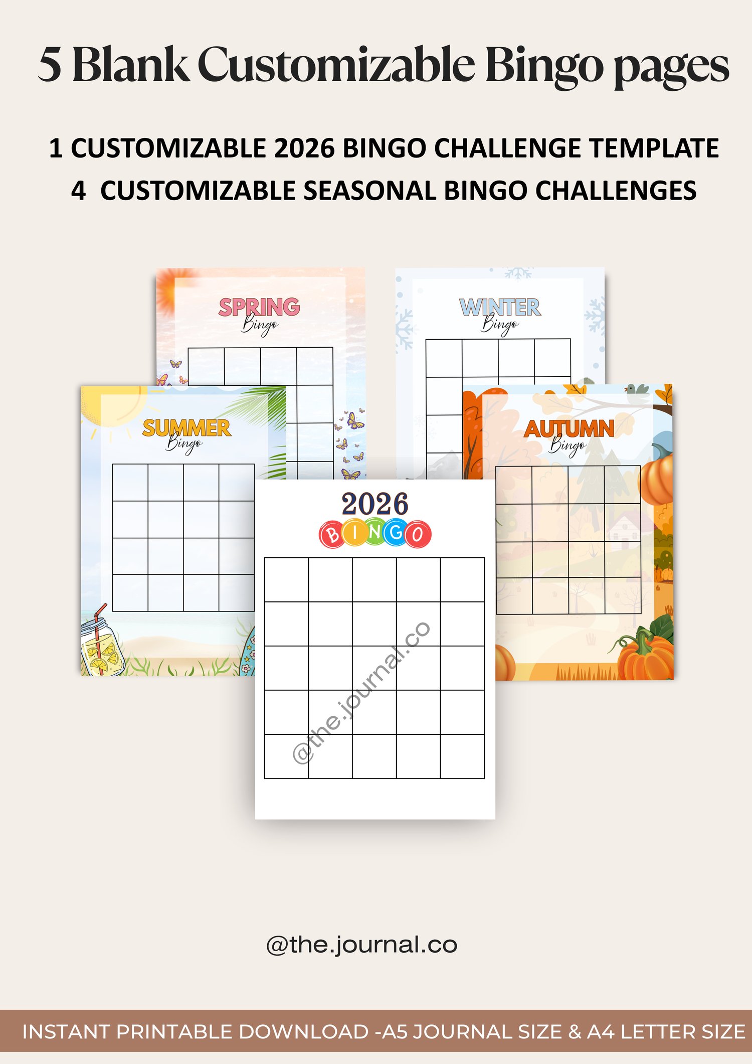 Turn your goals and seasonal fun into a game with this comprehensive Bingo Challenge Bundle! This pack includes a major 2026 Yearly Bingo Card and four themed Seasonal Bingo Cards (Spring, Summer, Autumn, Winter), all pre-filled with fun, thematic challenges. We also include a blank template for each card, giving you 10 pages total and making every challenge fully customizable to your unique goals and activities!