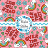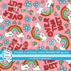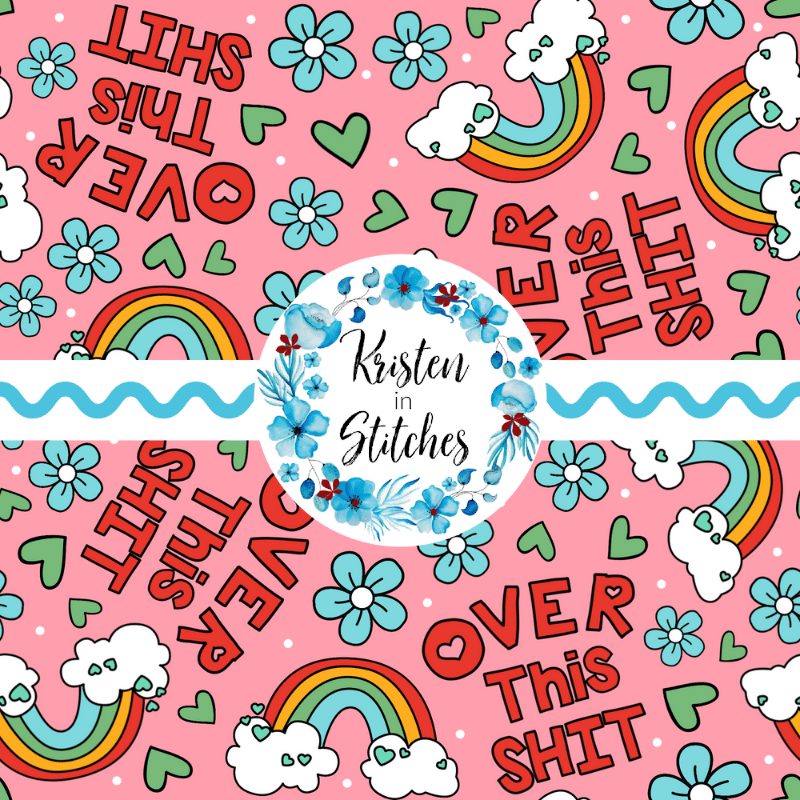Over This Shit humorous sweary pattern with rainbows, flowers and hearts on pink.