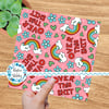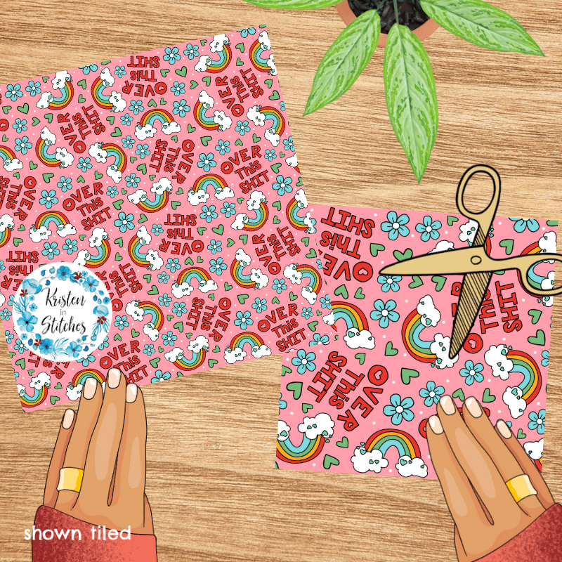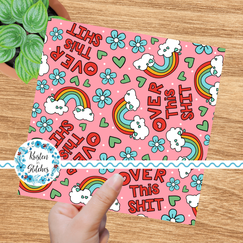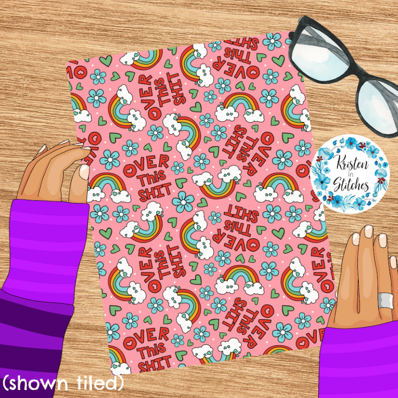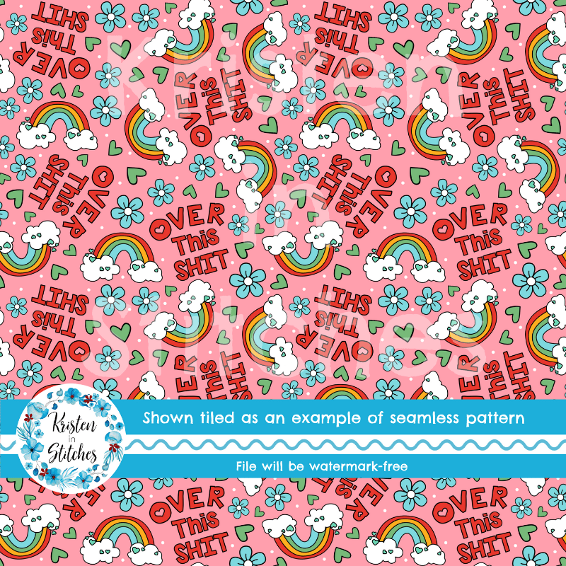 Over This Shit Swear Word Seamless Pattern, Pretty Profanities, Rainbows and Flowers, Pink