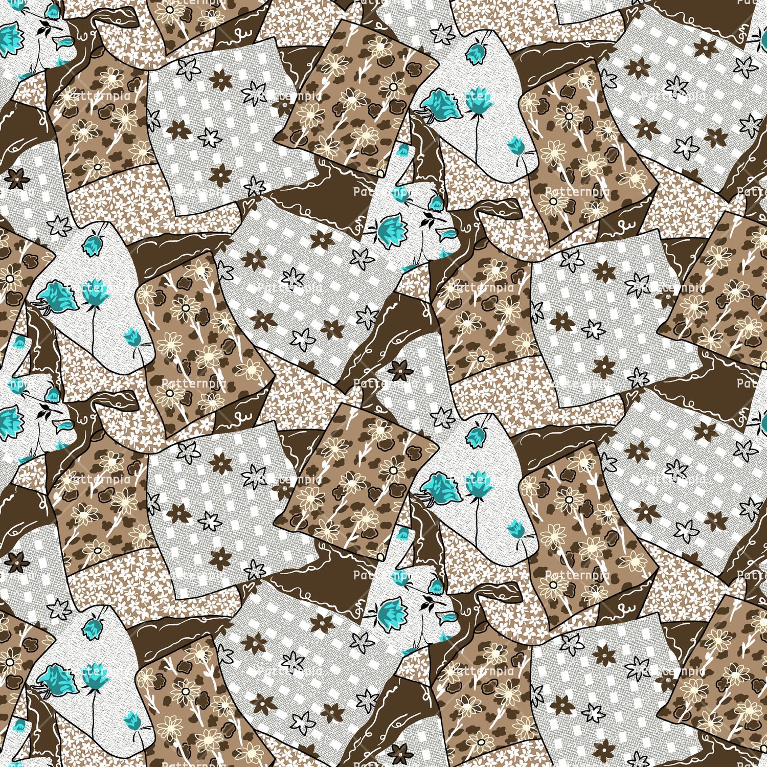 Rustic brown and cream patchwork with teal floral pops.