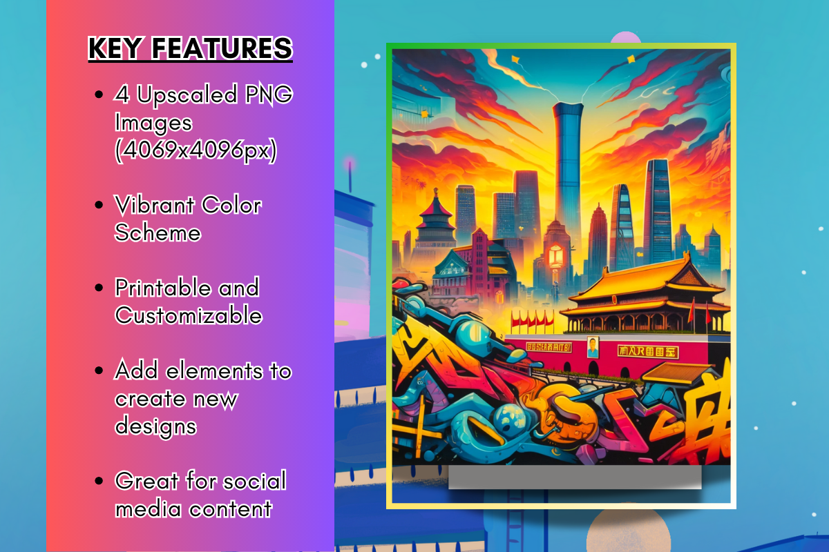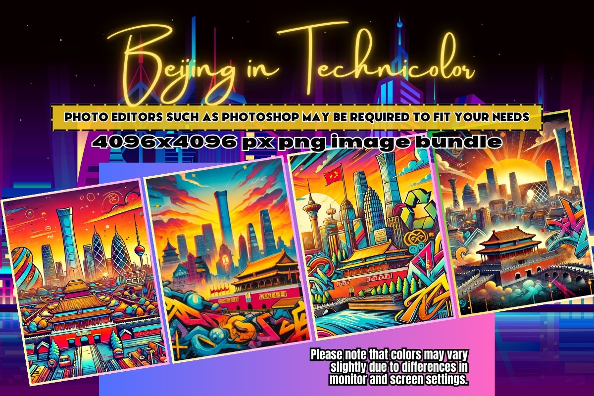 Transform your creative projects with our "Beijing in Technicolor" collection. This set features four stunning PNG images showcasing the iconic Beijing skyline in a vibrant, neon-inspired style. Each image is meticulously designed to capture the energy and beauty of Beijing's urban landscape, perfect for both digital and physical creations.