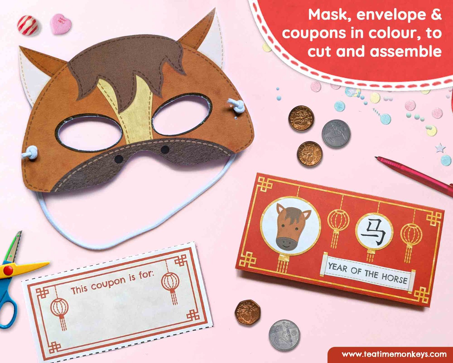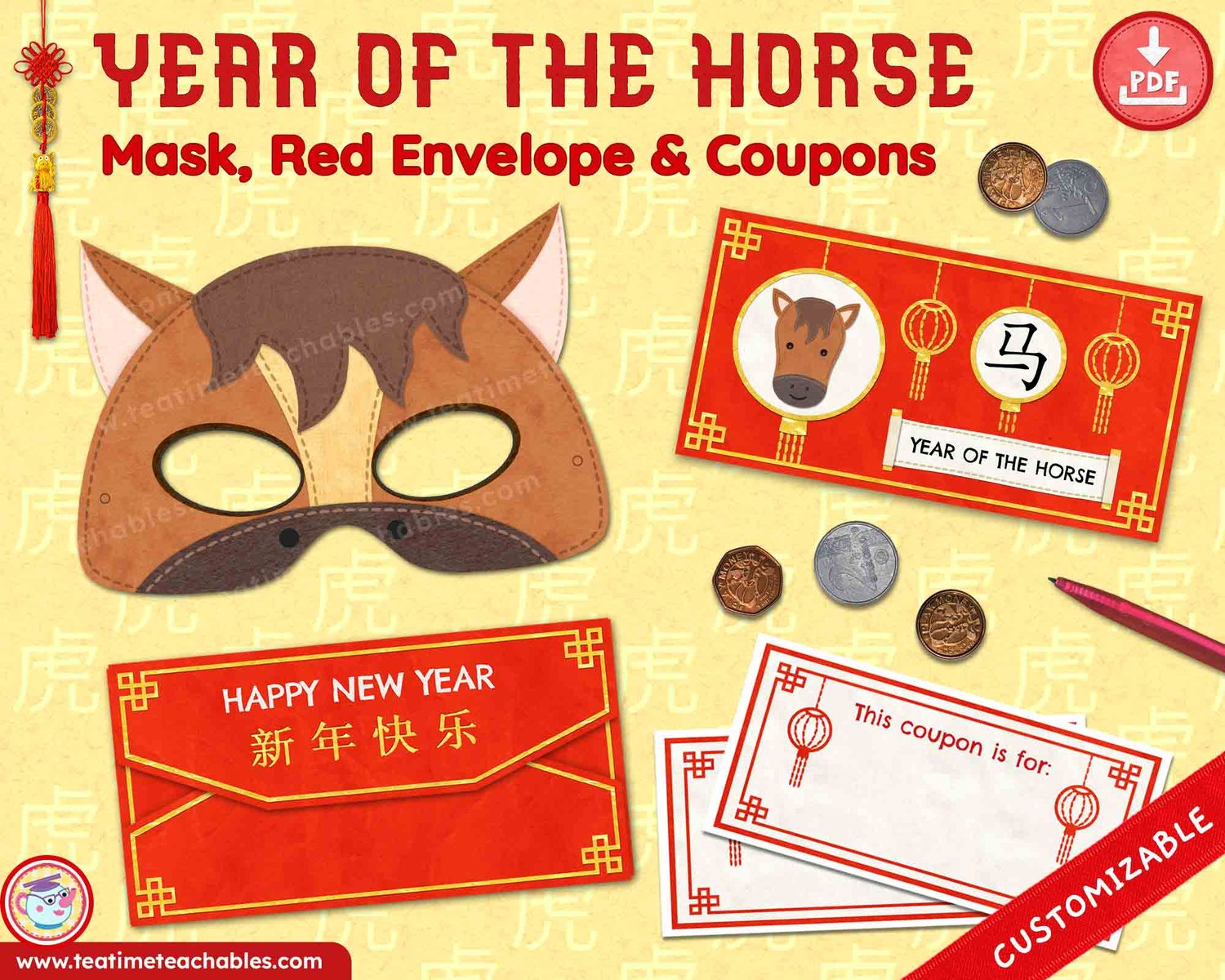 **THIS PRODUCT IS ALSO AVAILABLE IN BLACK LINE: Year of the Horse Craft: Mask & Lucky Envelope with Coupons for Coloring**