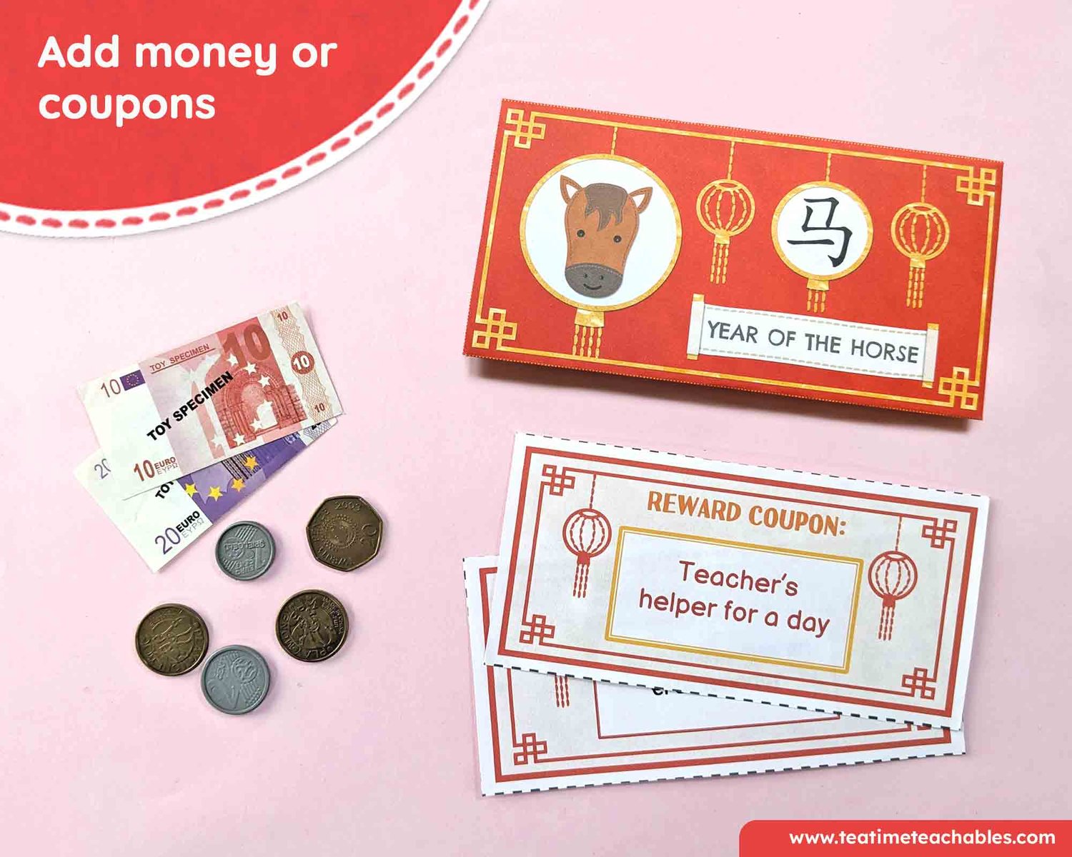 The lucky red envelope features a horse illustration, the Chinese character for “horse,” and “Happy New Year” written in both English and Chinese. An editable text box allows you to add a child’s name or leave it blank for students to write their own message (please note: the font used on the envelope itself is not editable).