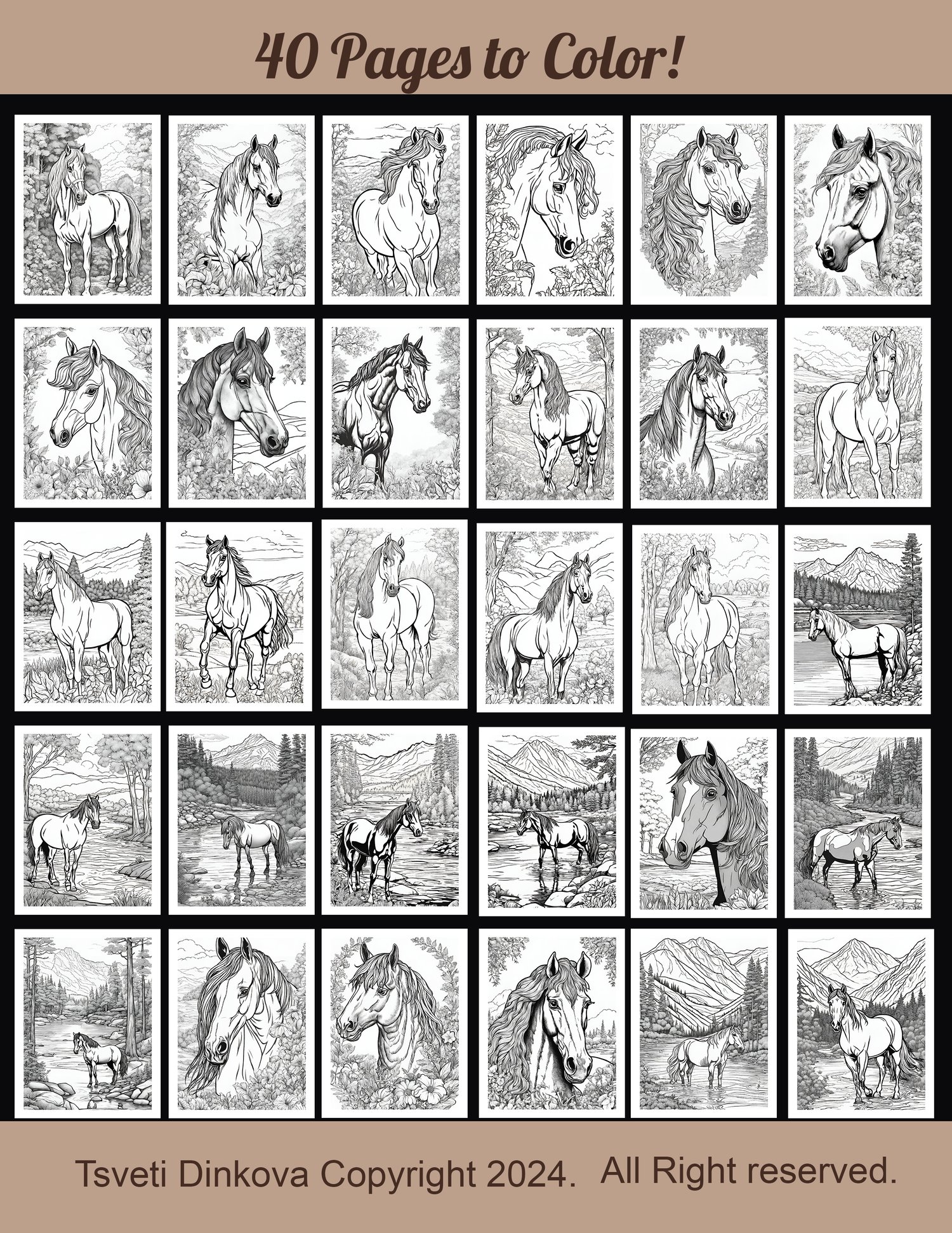 Whether you're a seasoned artist or simply seeking a therapeutic escape, our coloring book provides hours of joy and tranquility. Let your imagination run wild as you bring these graceful equine creatures to life with a splash of color. Unwind, unplug, and reconnect with the beauty of nature through the grace of horses in this delightful coloring adventure.