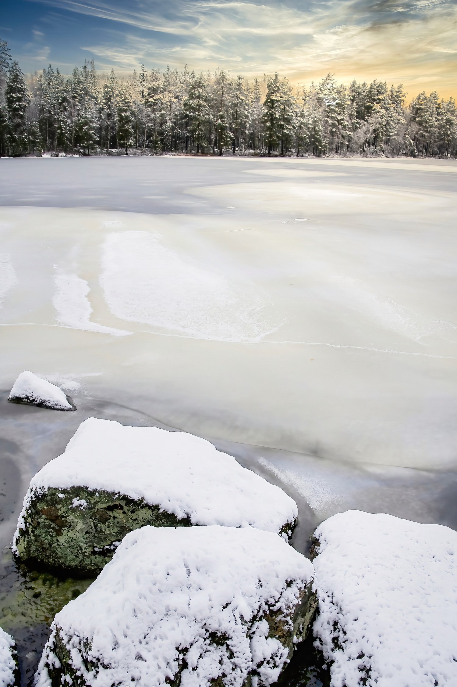 The lake is already almost frozen. The last rays of the sun still color the clouds.