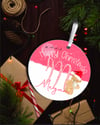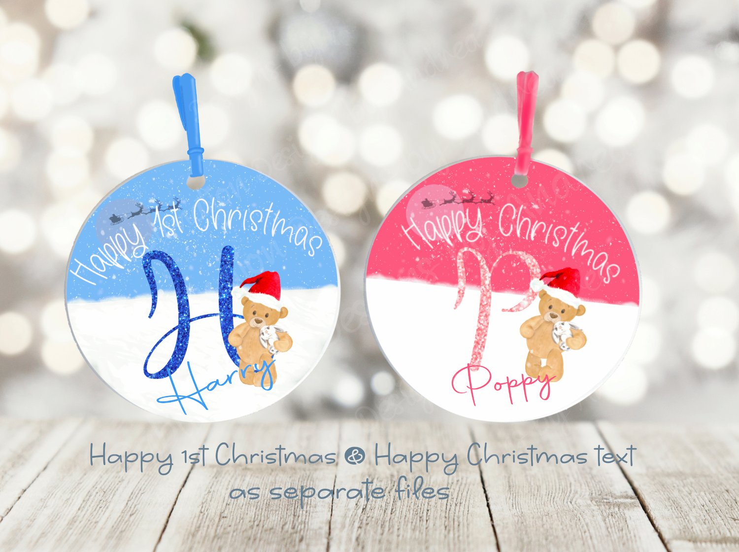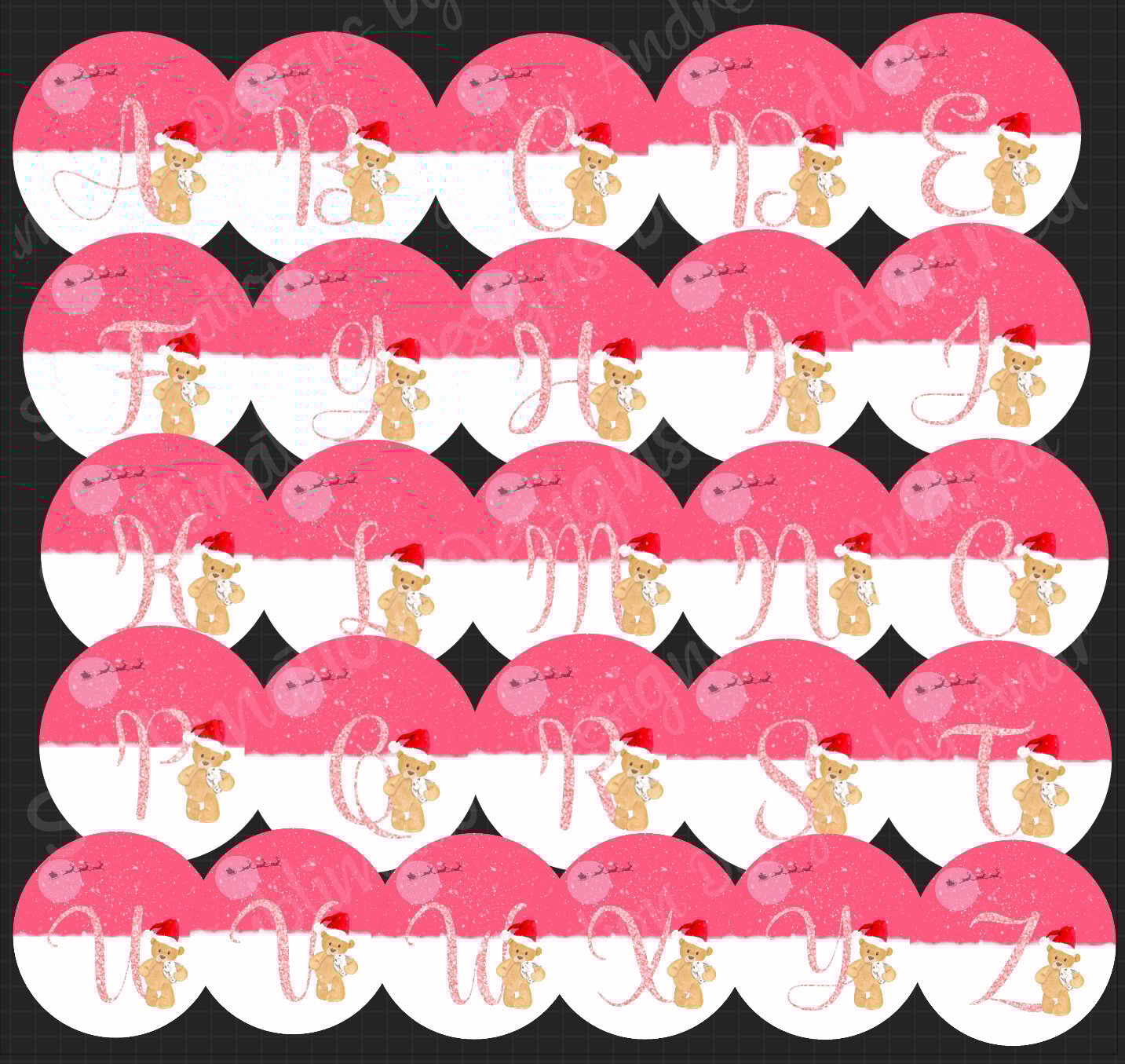 Pink glitter alphabet design for round ornaments, with hand painted bear and his cuddly toy. This file comes with 2 free text files - "Happy 1st Christmas" and "Happy Christmas"