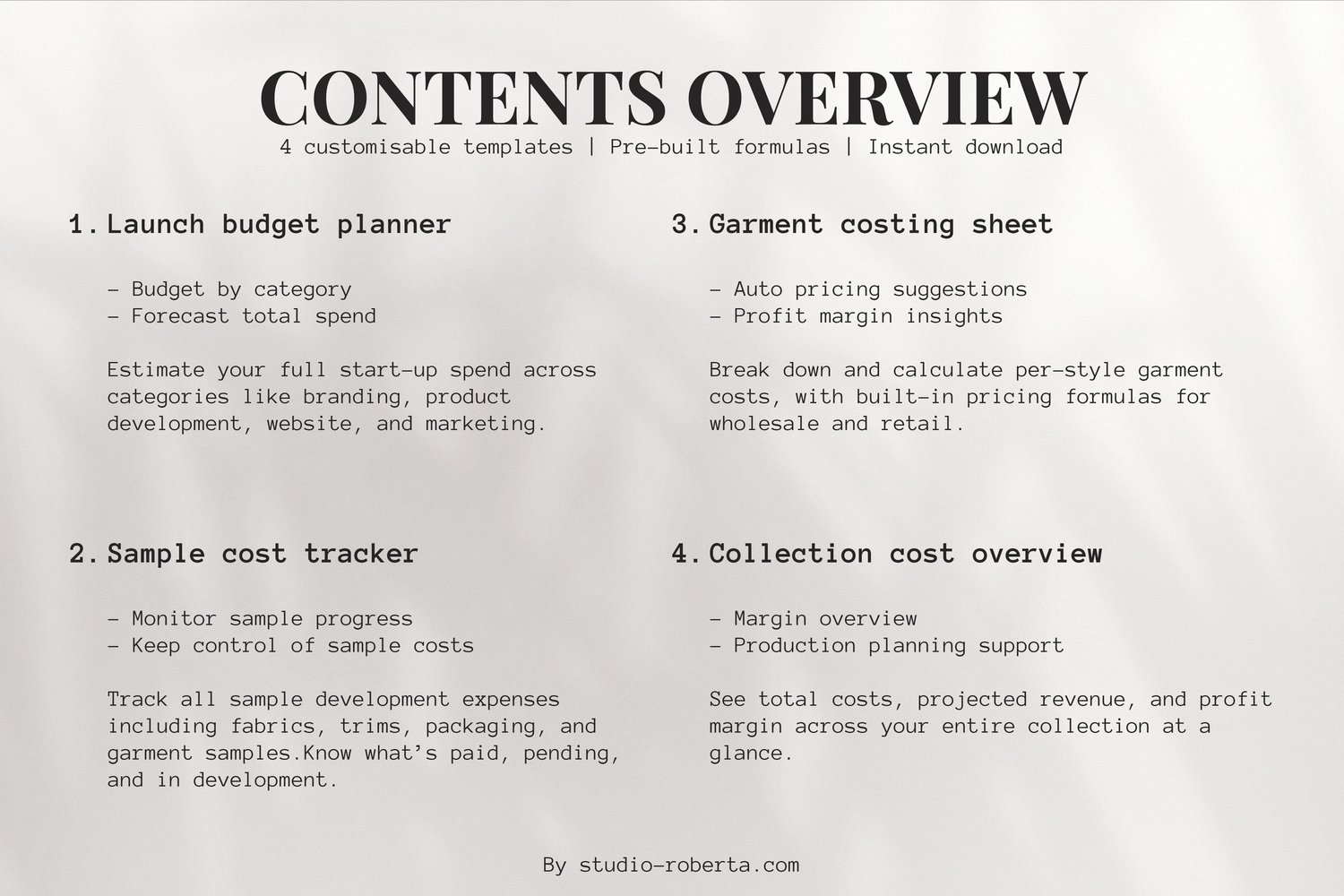 - Track, Adjust & Grow - Use the template to track costs, plan budgets, and guide production and pricing decisions.