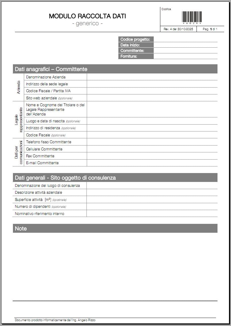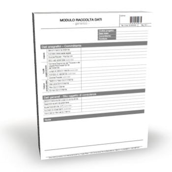 Il Modulo di raccolta dati per consulenze permette di rendere più sistematico l'inizio di un rapporto lavorativo consulenziale di tipo tecnico. Il documento, in formato A4, consiste in una tabella per la raccolta di informazioni anagrafiche ed ambientali. Tale strumento può essere particolarmente utile all'inizio del rapporto di consulenza o durante il sopralluogo preliminare, per raccogliere le informazioni chiave da utilizzarsi nel prosieguo del rapporto lavorativo e per evitare di tralasciare le informazioni anagrafiche, fondamentali per redigere documenti quali: relazioni, perizie, rapporti di prova, fatture etc.