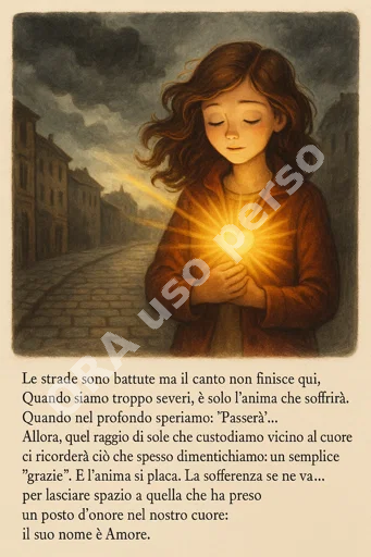 “Le strade sono battute ma il canto non finisce qui, Quando siamo troppo severi, è solo l’anima che soffrirà. Quando nel profondo speriamo. ‘Passerà’… Allora, quel raggio di sole che custodiamo vicino al cuore ci ricorderà ciò che spesso dimentichiamo: un semplice ‘grazie’. E l’anima si placa. La sofferenza se ne va… per lasciare spazio a quella che ha preso un posto d’onore nel nostro cuore: il suo nome è Amore.”