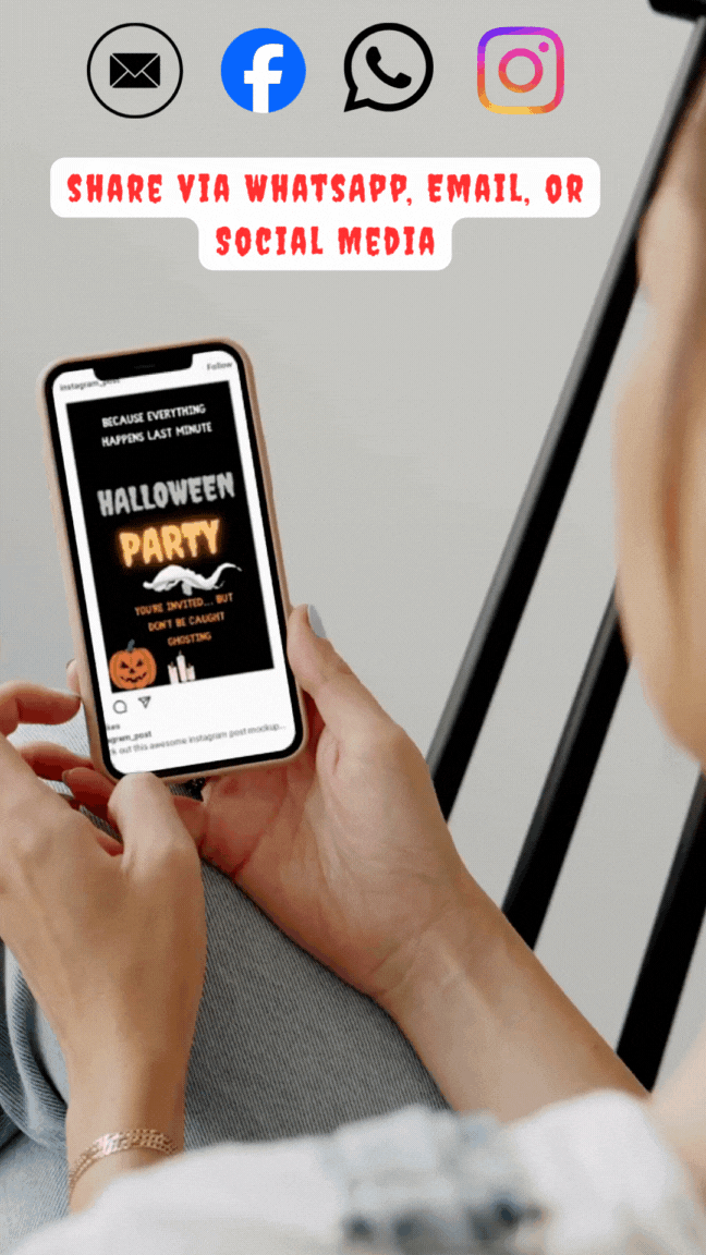 This animated Halloween invite is ready to share instantly. Just add your party details and send it via WhatsApp, Email, or Social Media. Featuring playful spooky vibes, dancing skeletons, and hauntingly fun graphics.
