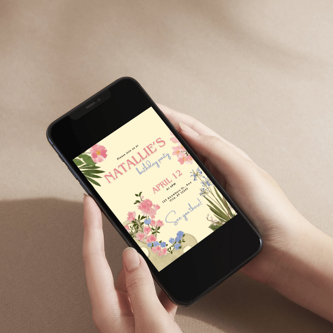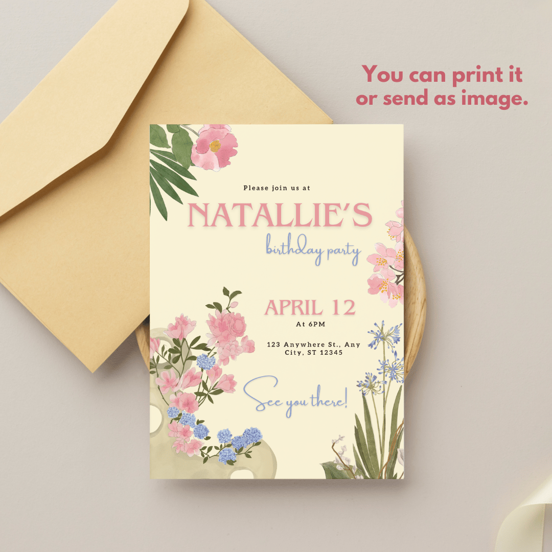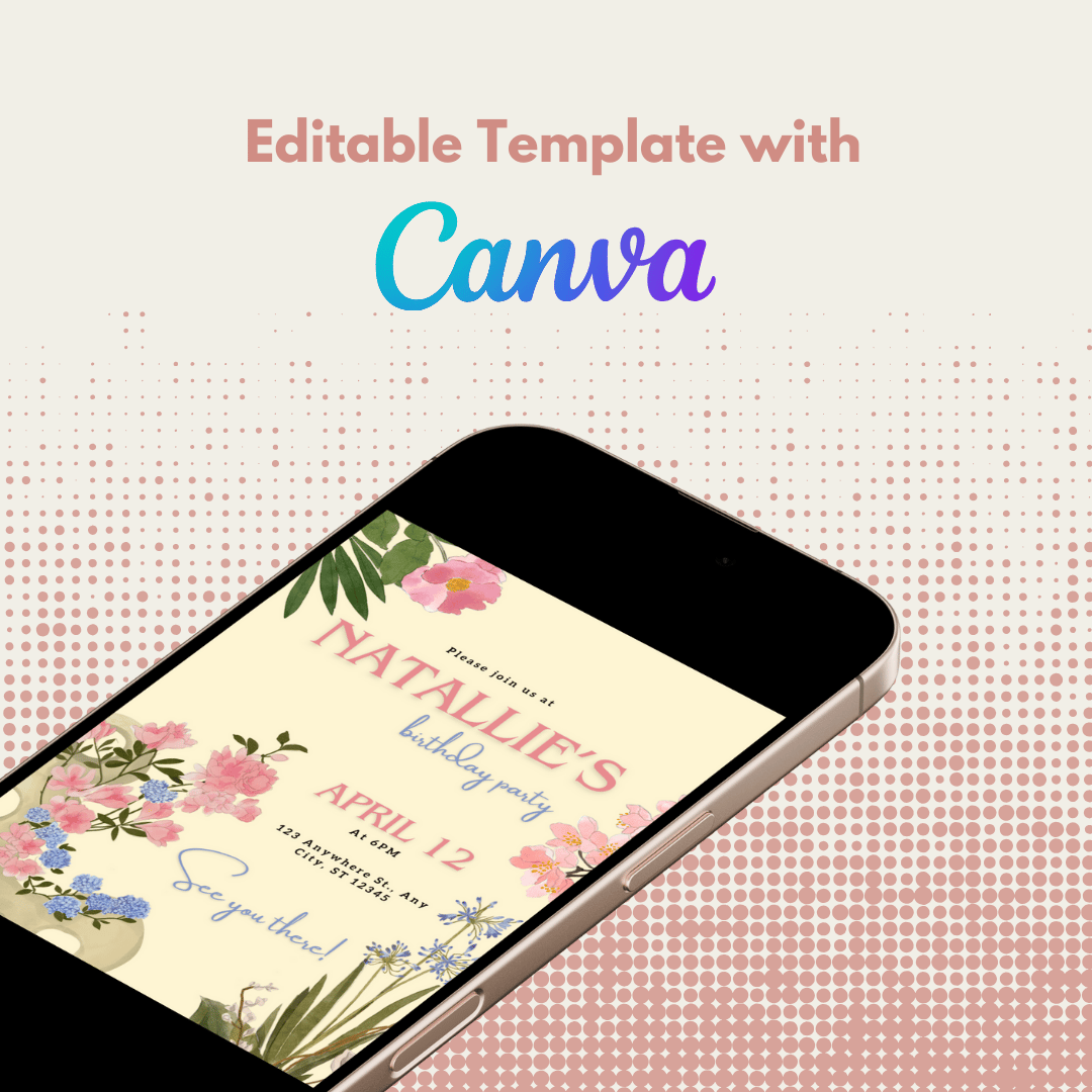 Featuring hand-drawn plants and flowers in a colorful floral design, this editable Canva template is perfect for a spring-inspired party. Its delicate and elegant style brings the beauty of Japanese ikebana art to your invitations.
