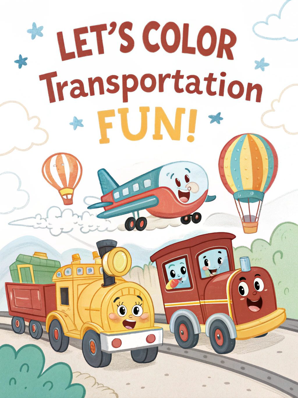 This fun and engaging coloring book features 44 unique transportation-themed pages, all in Disney-style 3D cartoon outlines — perfect for little hands to color!