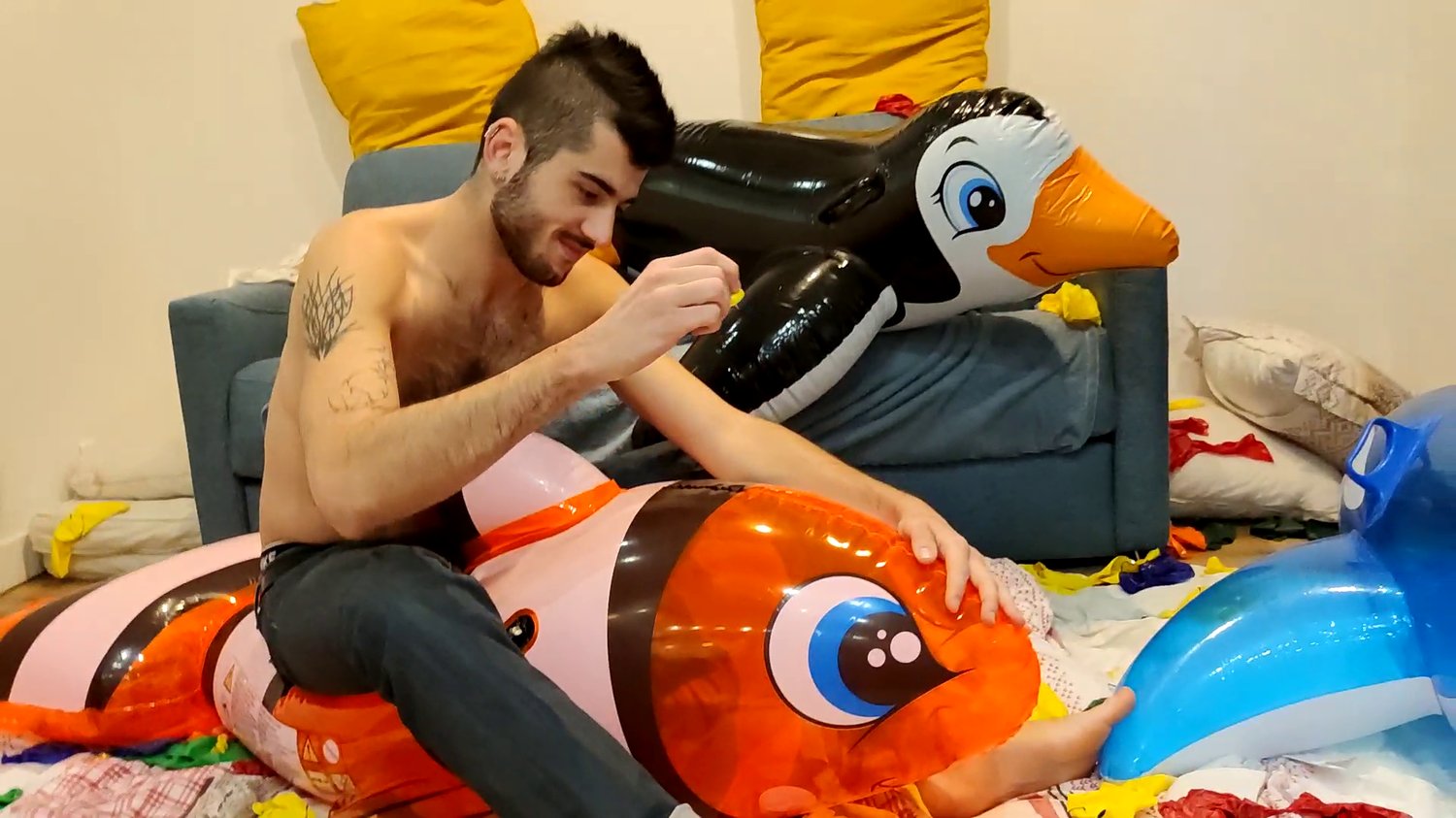Nelson pop his inflatable toys