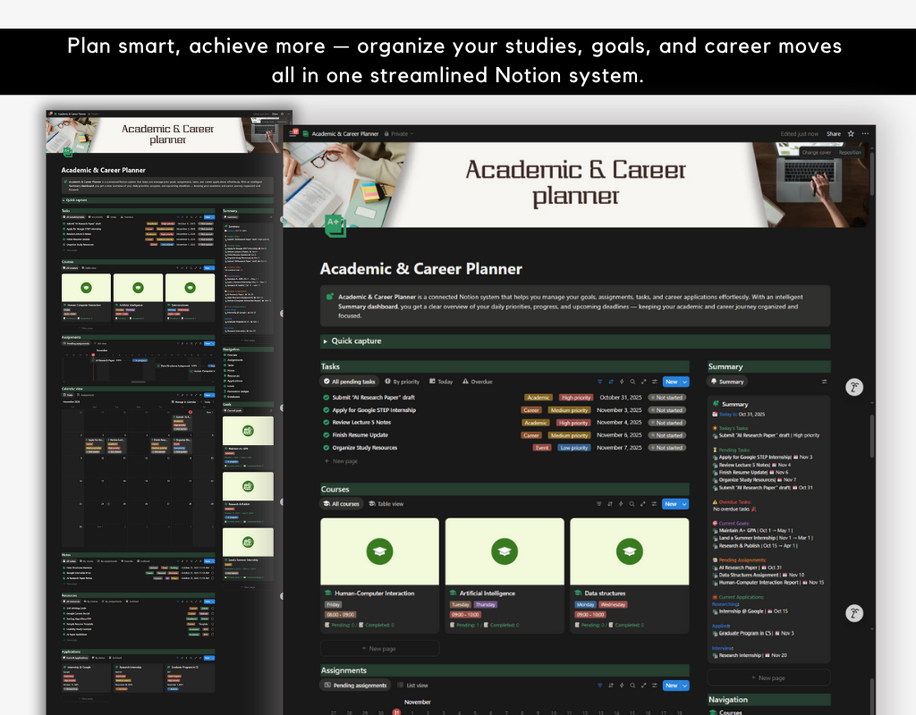 Meet the Academic & Career Planner — your ultimate Notion workspace to streamline your studies and career journey in one powerful system. ✨