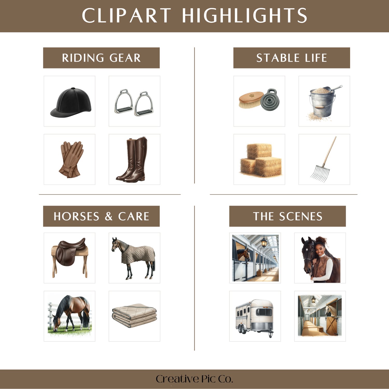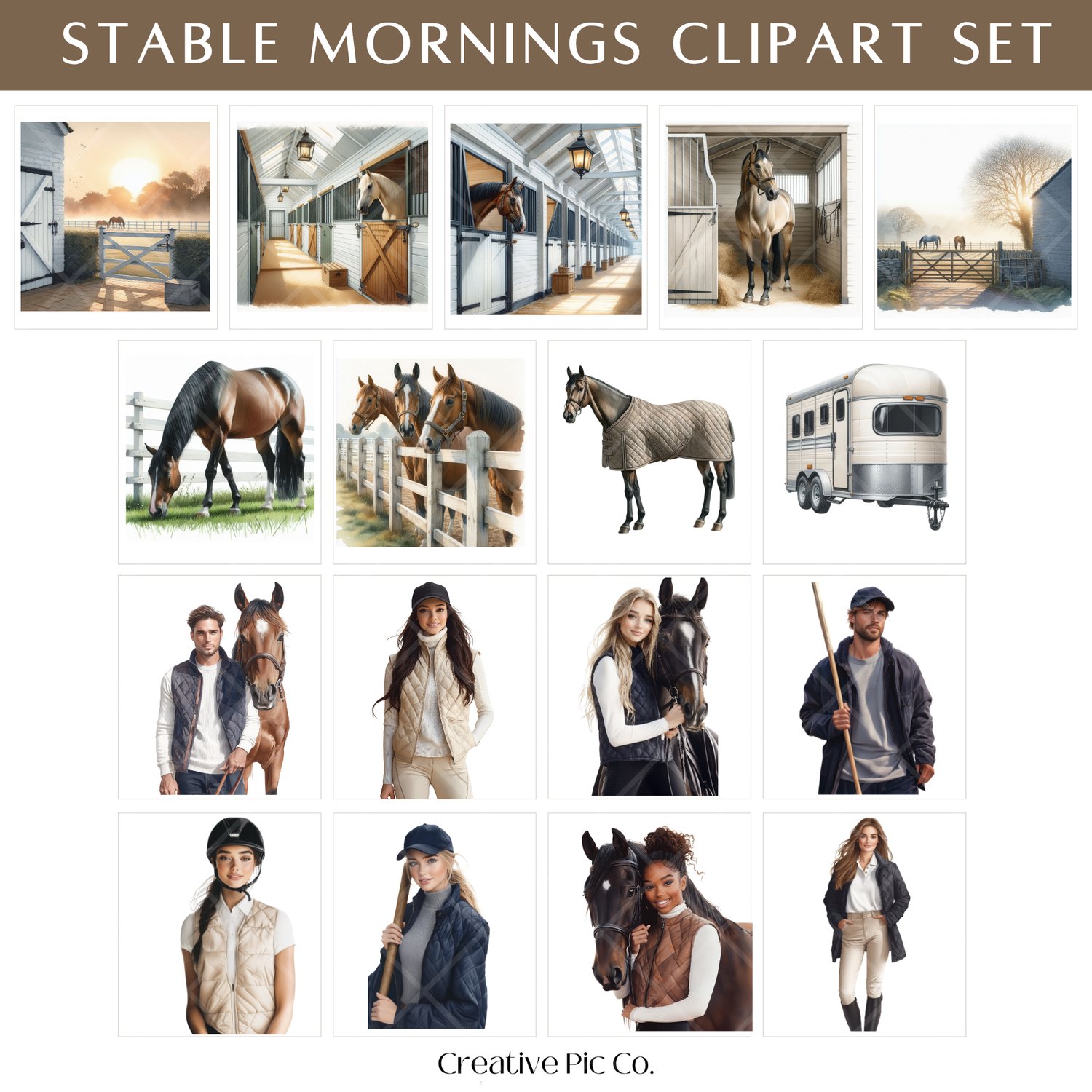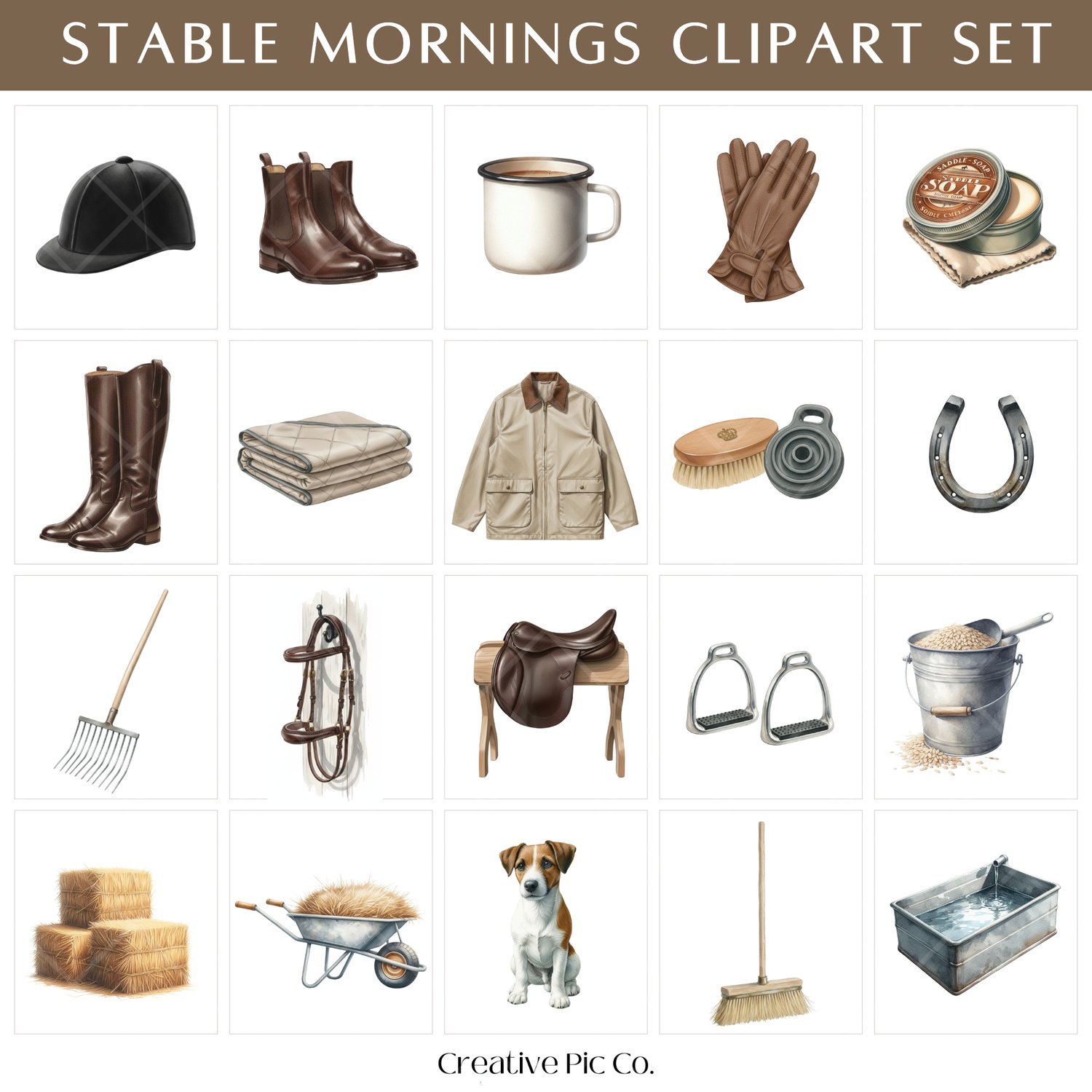 The Stable Mornings Clipart Set is designed for horse lovers, capturing the rustic charm of life in the stables. Featuring 37 high-quality PNGs, this collection includes horses, riding helmets, boots, bridles, saddles, hay bales, grooming tools, and cosy stable scenes. A soft watercolour aesthetic makes it perfect for planners, journals, equestrian-themed branding, and creative projects.