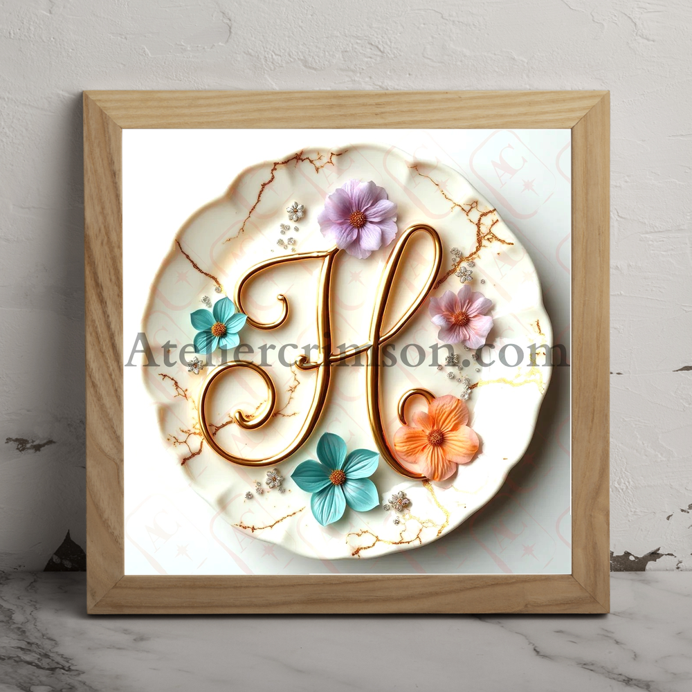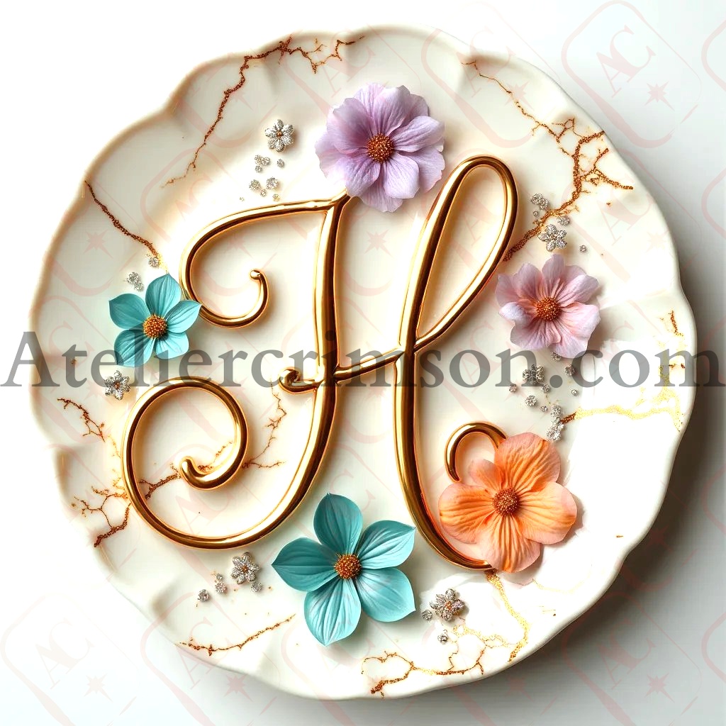 The letter H flowers and procelaine .Download Now this high quality AI-generated image, perfect for adding a touch of tranquility and creativity to any space.
