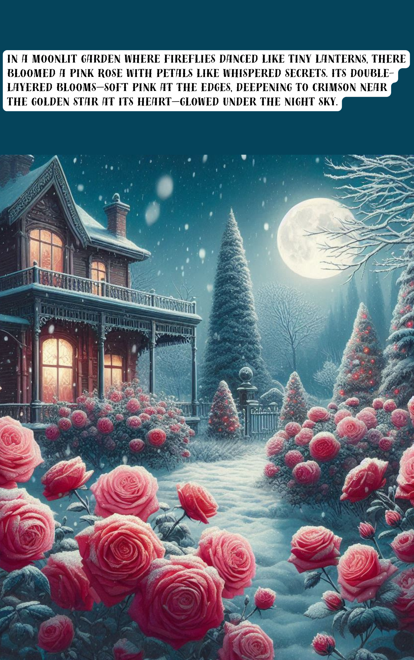 In a moonlit garden where fireflies flicker like lanterns of memory, a Pink Rose blooms with petals steeped in tenderness and truth. Her double-layered blossoms—soft pink fading into crimson—cradle a golden star at their heart, a quiet symbol of love’s complexity. From the hands of a gentle botanist to the embrace of a young couple, through seasons of warmth and frost, this rose becomes more than a flower—she becomes a legacy of enduring affection.
